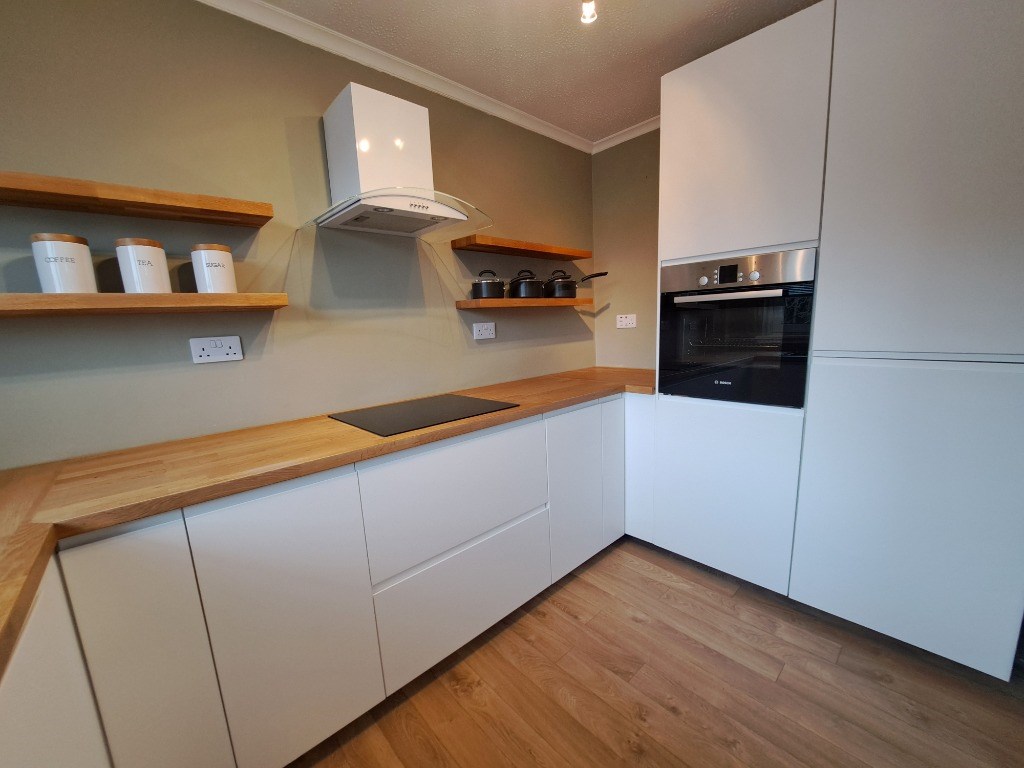 A stylish fitted kitchen with white gloss units, laminate flooring, integrated fridge freezer, integrated oven and hob and a dining area with table and chairs.