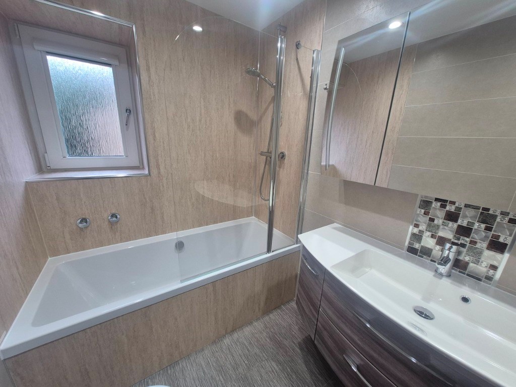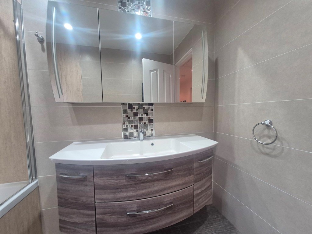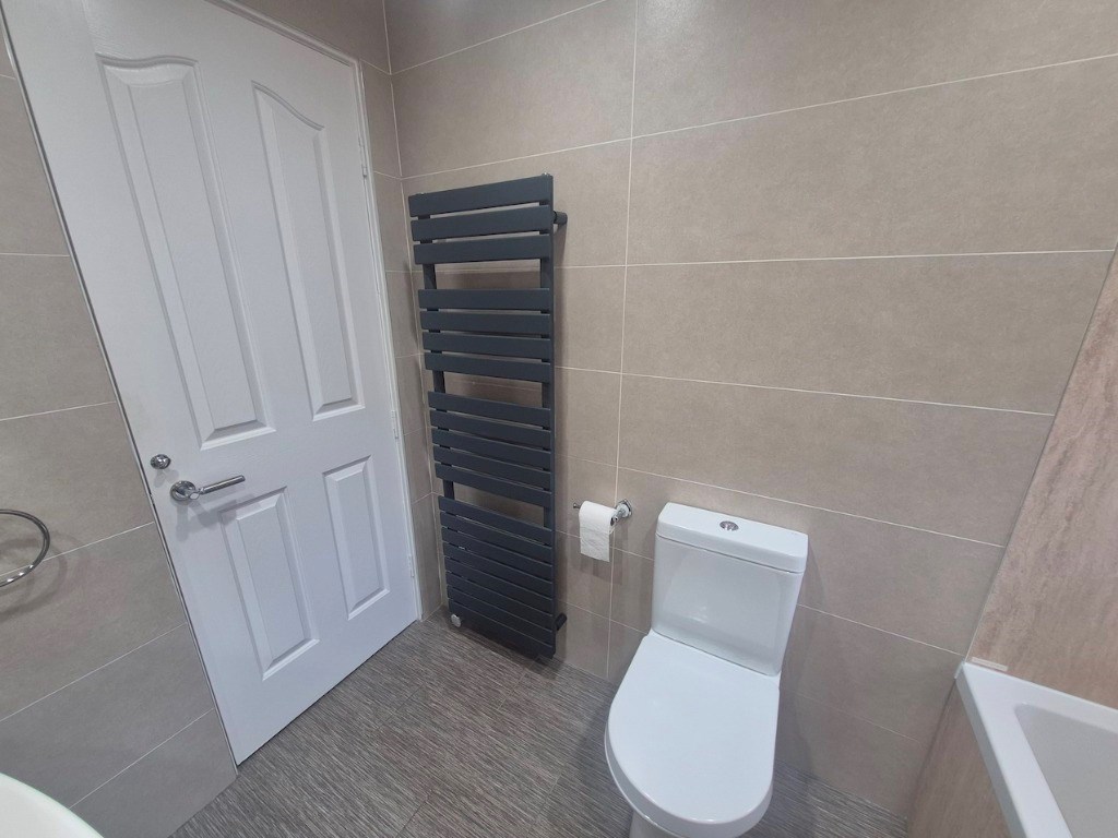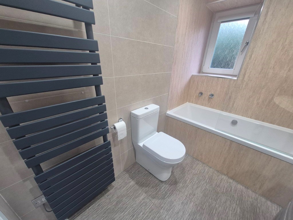Modern tiled bathroom with a shower over the bath, sink unit and WC . Wall mounted heated towel radiator and tiled floor.