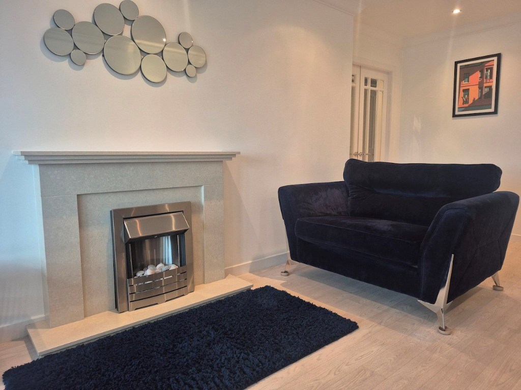 A spacious lounge with a seaview, laminate flooring, feature fireplace with electric fire and stylish furniture.