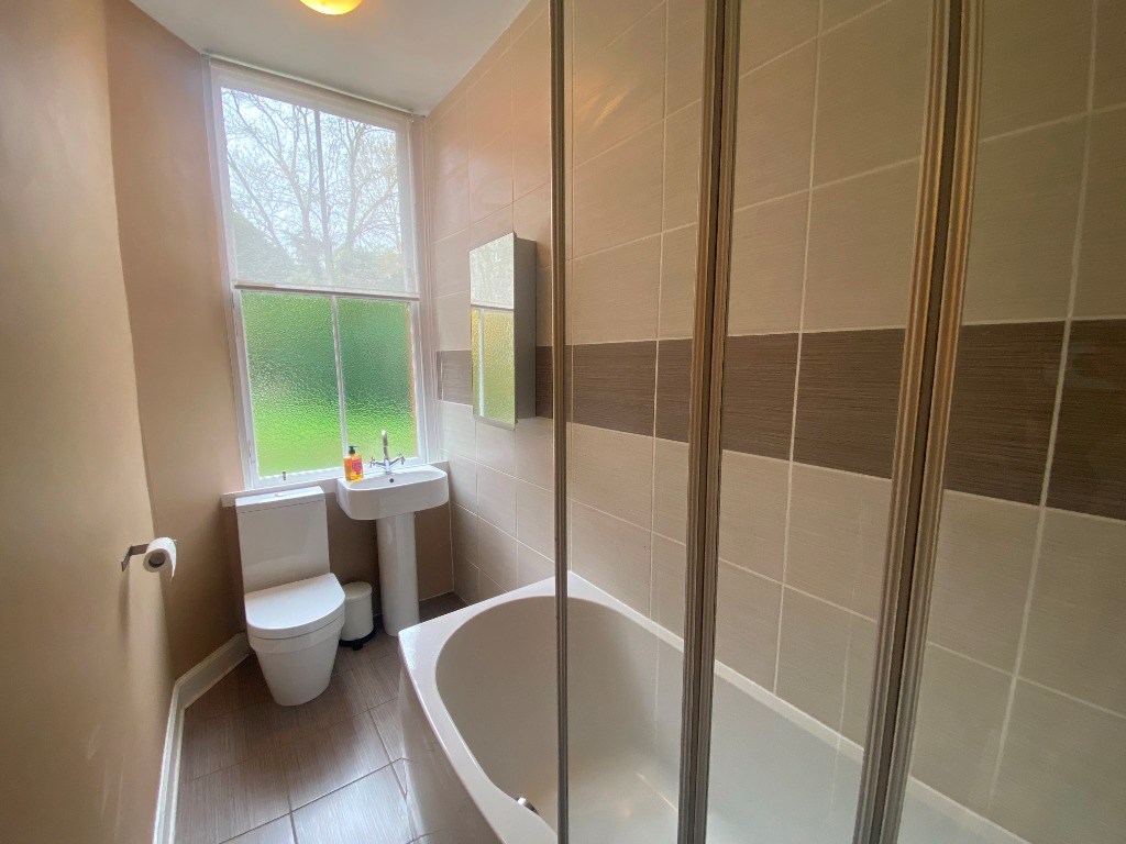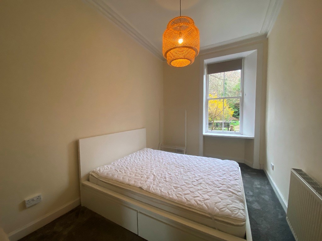 The double bedroom is carpeted throughout and has a window looking out into the shared garden. The double bed centres the room leaving room to walk around. There is space for a chest of drawers or wardrobe on one side of the bed, on the other side of the room there is a free standing mirror, bedside table and chest of drawers.