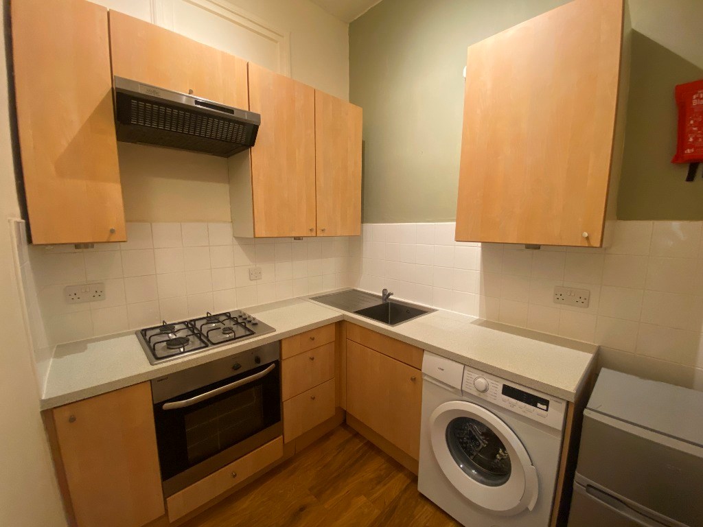 The kitchen just off the hallway has electric oven, gas hob, washing machine and fridge freezer, and sink with drainer. The kitchen has cabinets above and below the worktops, giving plenty of storage options. There ample amount of worktop space for cooking. There are two shelves perfect for storaging spices.