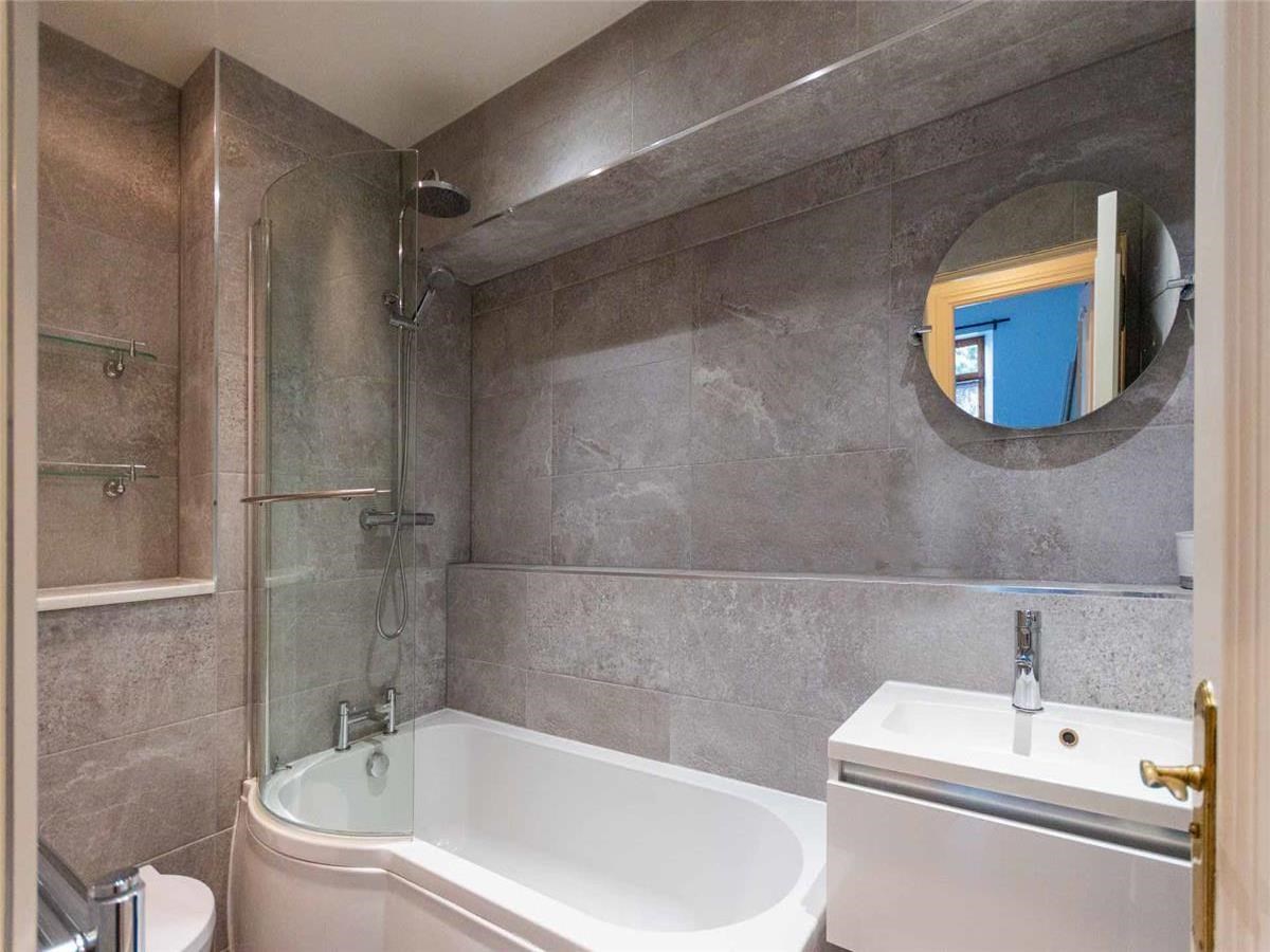 ~Sleek family bathroom with desirable three-piece suite including mains shower over bath