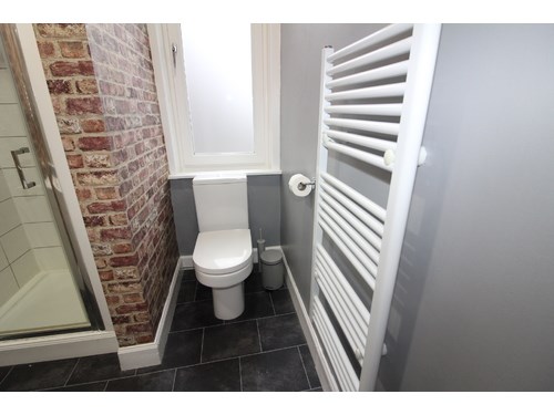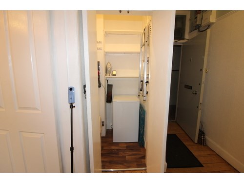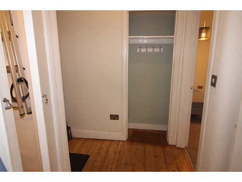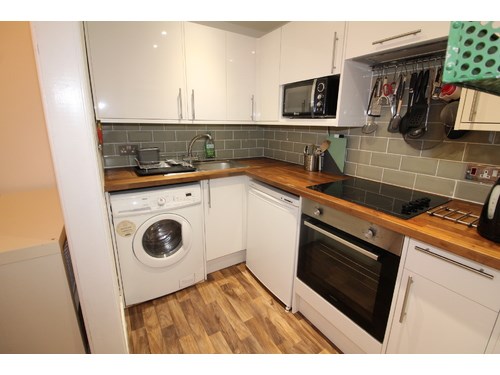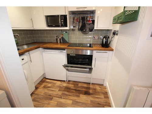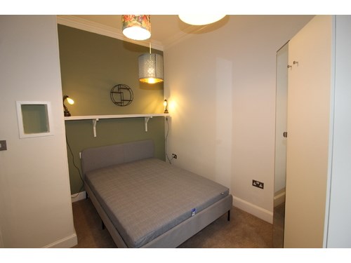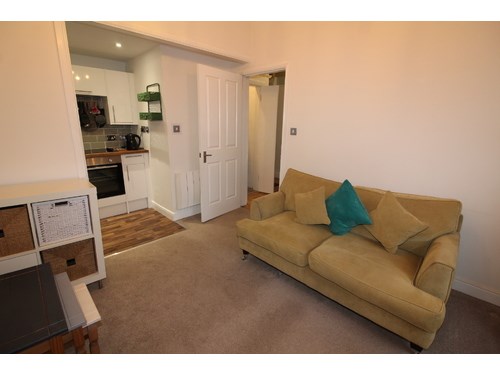 Entrance hall with large storage cupboard & freezer . Double bedroom with free standing wardrobe and recessed double bed. Lounge with sofa and armchair , standard lamp and nest of tables. Fitted kitchen with microwave , electric hob , Fridge , oven and washing machine. Shower room with cubicle , sink unit and wc. Ladder style heated towel rail. Tiled flooring and new window. Ideal for working professionals.