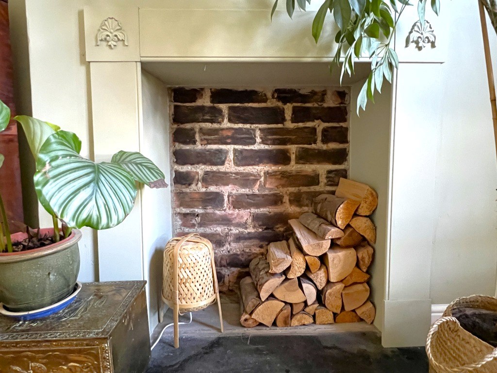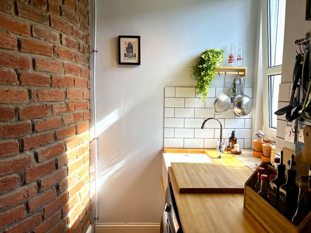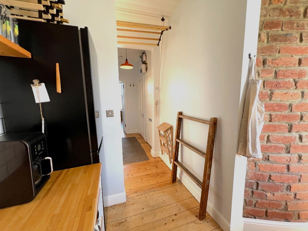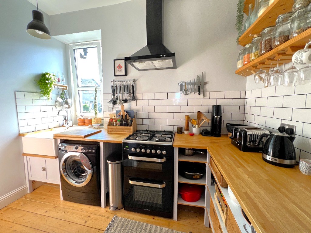 The kitchen reimagines a traditional, rustic aesthetic with a contemporary edge. Its design incorporates eye-catching features such as a Belfast sink, wine glass hangers and open storage units and shelving. Wooden worktops and floors clash perfectly with white splashback tiling and exposed red brickwork. On a practical level, the kitchen has all the appliances you would expect. There is a freestanding fridge-freezer, a twin-door oven with a gas hob and a washing machine.