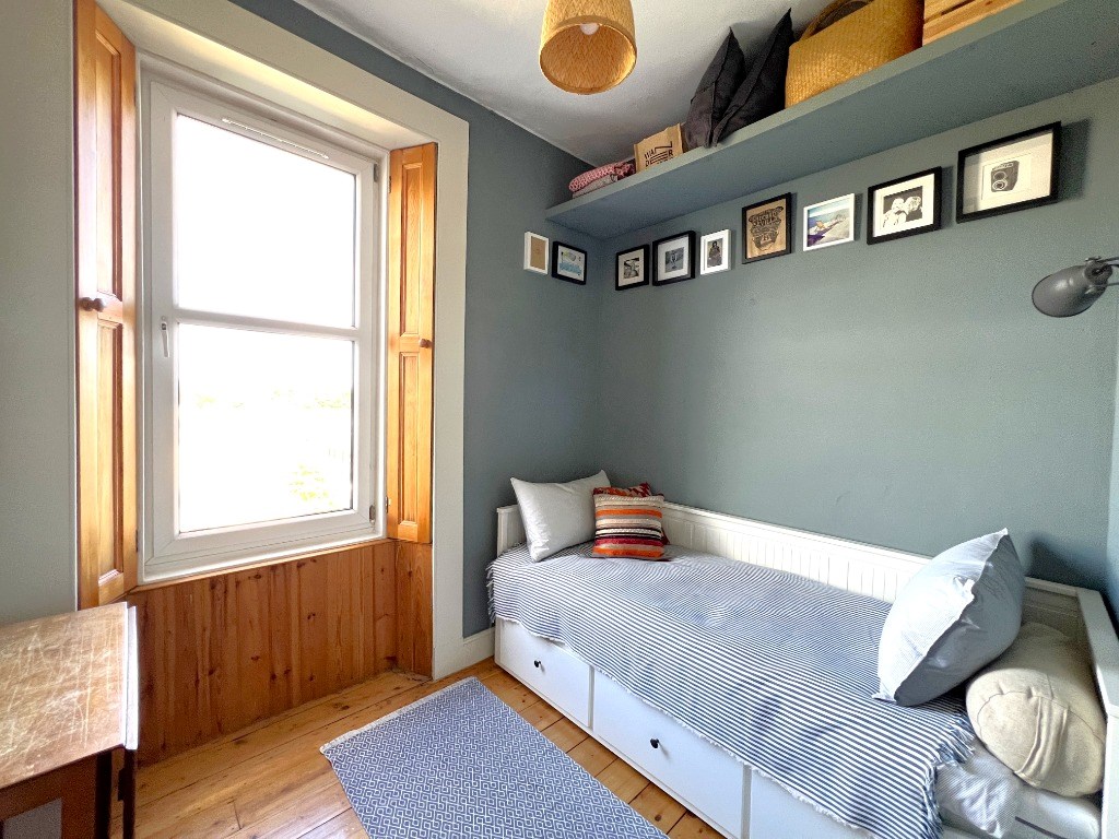 The second bedroom, while smaller than the main bedroom, shares the expansive views that the living room has over Leith. As it is presented unfurnished, it would be ideal as a guest bedroom or as a place to work from home (for one or two people). It also benefits from high-level shelving.