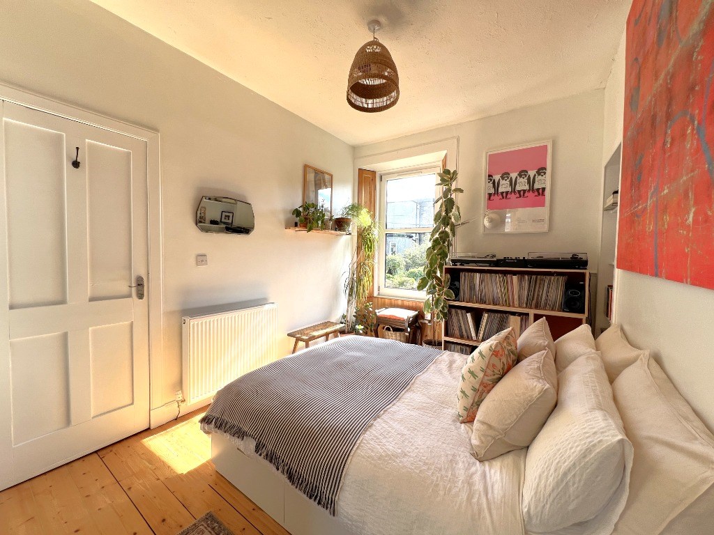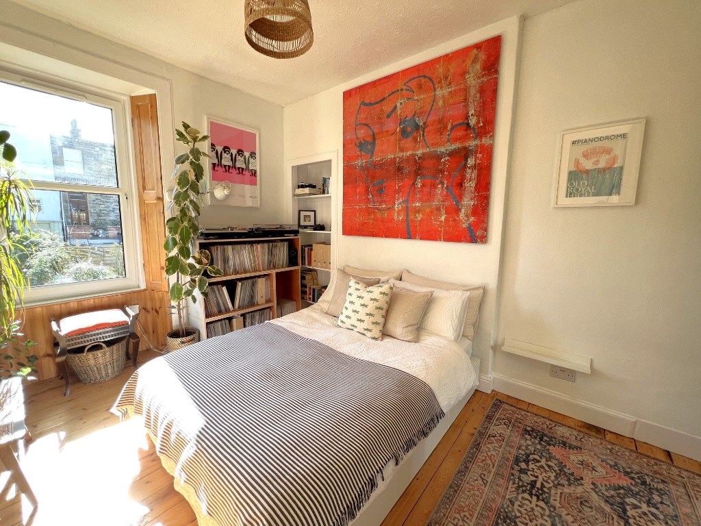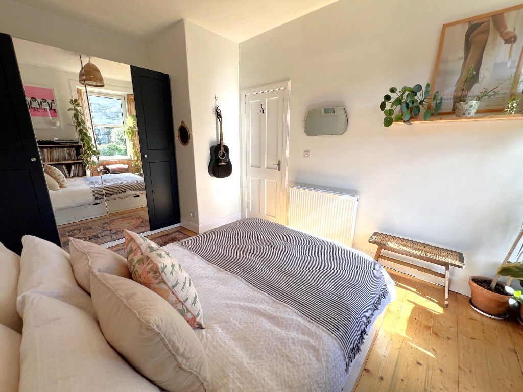 Various period features are showcased in the main bedroom. This bright, south-facing room will have a large fitted wardrobe (with mirrored doors and both drawer and hanging space) and a brand new kingsize bed provided. There is also another Edinburgh press, this time with exposed shelving.