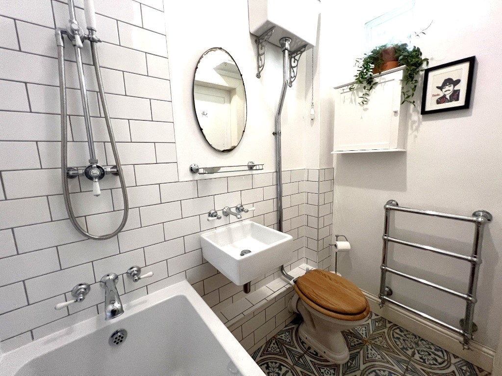 The heritage-style bathroom has been brilliantly laid out to maximise the use of space. There is a deep bathtub with a shower over (with both monsoon and adjustable showerheads), a vintage high-level toilet and a heated towel rail. Effective use of tiling (both white on the walls and patterned on the floor) helps add further to this room’s charm.