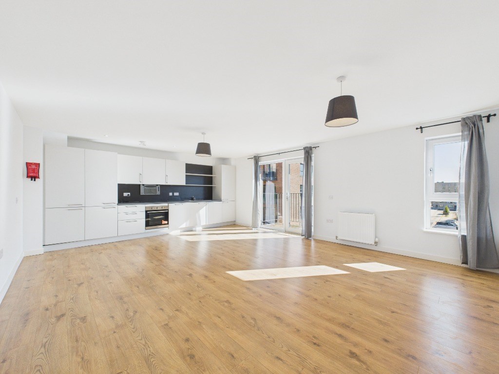 The property boasts a large open-plan kitchen/living room space with balcony access, two double bedrooms (one with an en-suite), and a modern three piece bathroom.