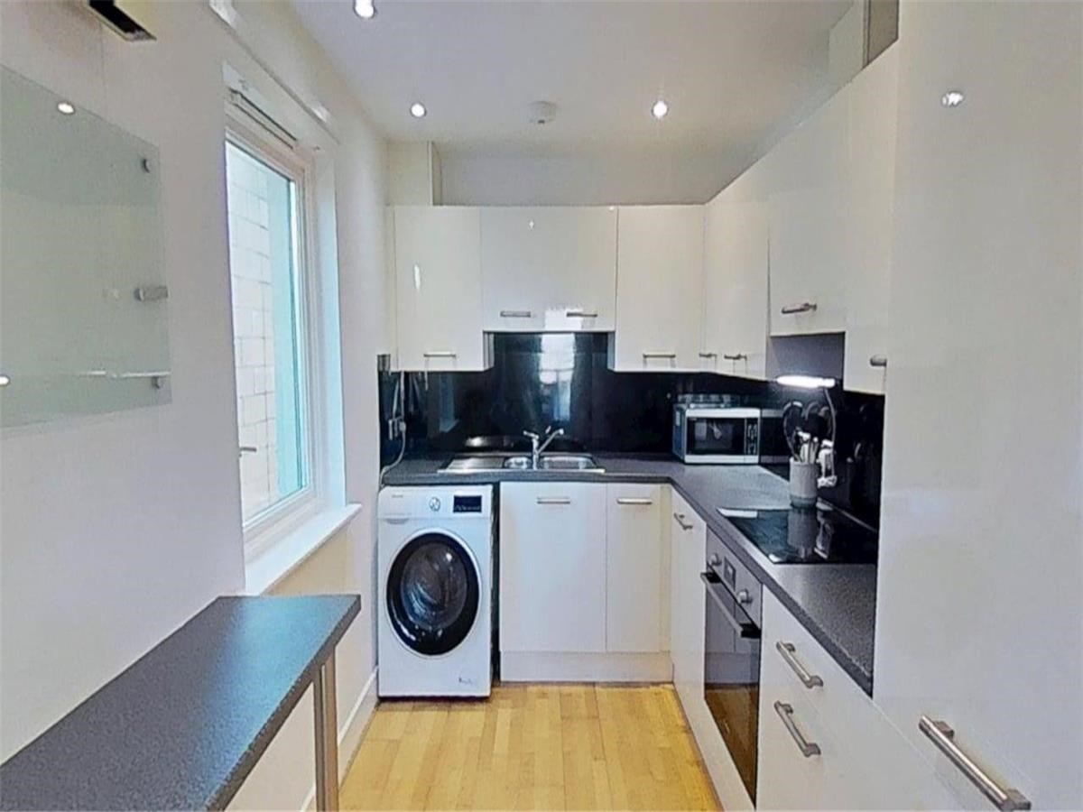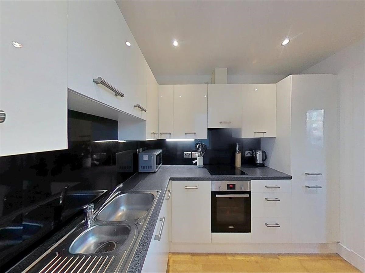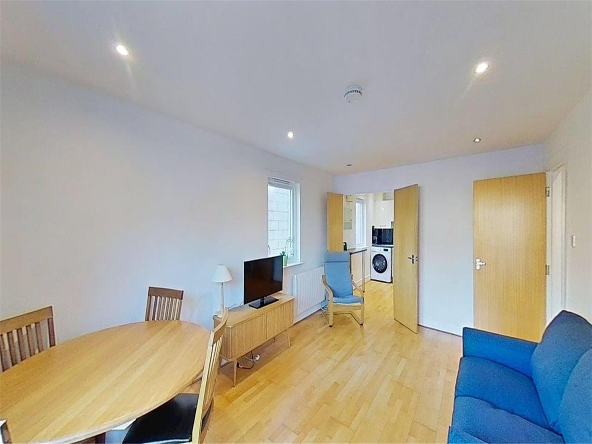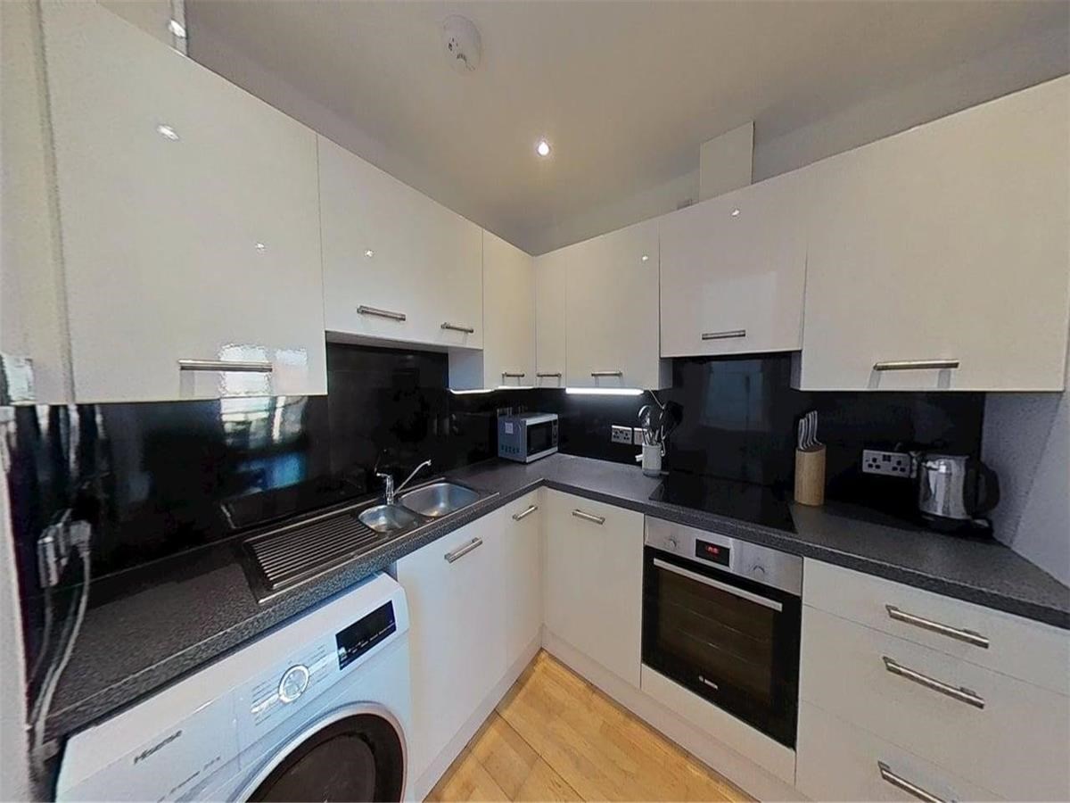 The accommodation opens with a welcoming entrance hallway providing access to all rooms within the property. The generous living and dining area benefits from twin windows and a Juliette balcony, allowing an abundance of natural light to flood the space and create a bright and inviting atmosphere. Adjacent to the living area is a modern fitted kitchen finished with white high-gloss units, ample worktop space, and a range of integrated appliances, offering both style and practicality. There are two well-proportioned double bedrooms, each fitted with mirrored double wardrobes providing excellent storage. The property is completed by a stylish bathroom featuring a white three-piece suite, shower over the bath, vanity unit, and heated towel rail.