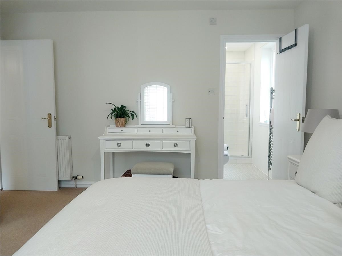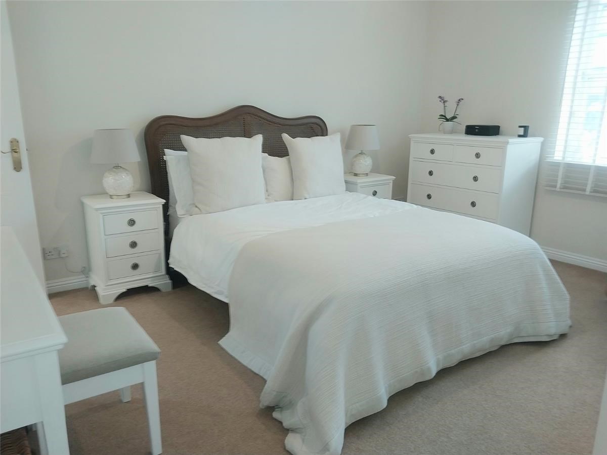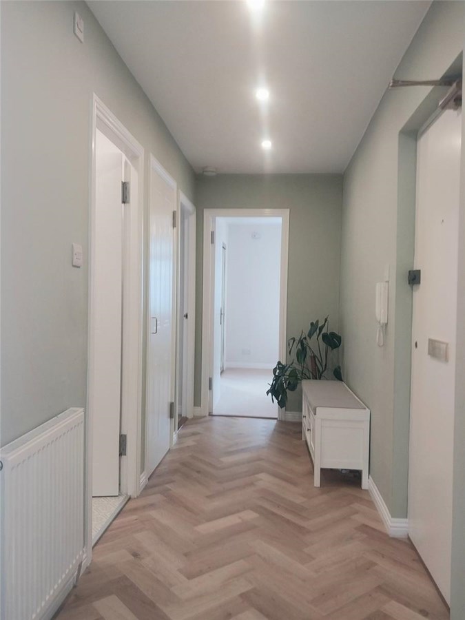 The bright, neutrally decorated accommodation comprises a welcoming hallway with a spacious storage/utility cupboard providing access to all rooms. The large, contemporary corner-aspect lounge with dining area is filled with natural light from French doors opening onto dual Juliette balconies. A modern kitchen features wall and base units, tiled splashback, integrated appliances, and a breakfast bar. The principal bedroom benefits from a built-in wardrobe and stylish en-suite shower room; a further double bedroom also offers a built-in wardrobe; and a stunning family bathroom with a three-piece white suite, bathtub with overhead shower, and a large open recess completes the property.