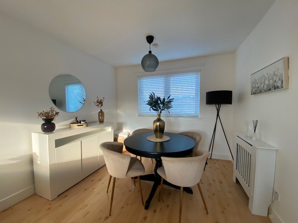 The main feature of this proeprty is the open plan living/dining room with a juilet balacony. The room is spacious, it has a round 4 seater dining room table with chairs, sideboard with storage and mirror above. There is a window at one side of the room and a juilet balcony doors at the other allowing light to flood in from either side of the room. There is a large L shaped sofa seating up to four people. The flooring is wooden and there is a decorative rug and curtains to complete the room.