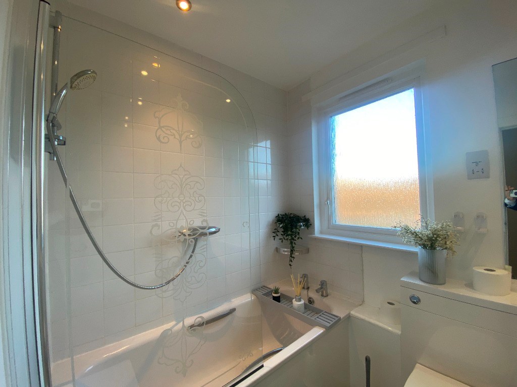 The modern bathroom has a shower over bath, toilet and sink with storage unit underneath. The room is partialy tiled, making it easy to clean and maintain. The obsecured glass window allows for privacy and for light to enter the room.