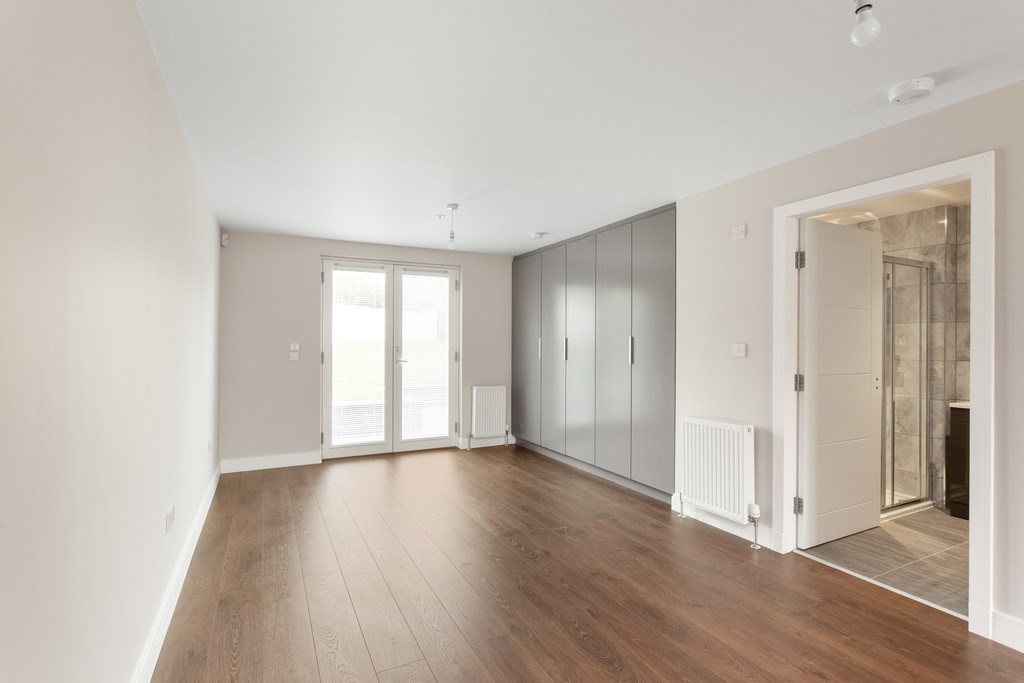 LOUNGE/KITCHEN/BEDROOM  Spacious living, cooking and sleeping area, offering ample space for an array of lounge, dining and bedroom furniture. The kitchen is fitted with modern high gloss wall and base units with integrated appliances - steel extractor hood, ceramic hob, electric oven, washing machine and fridge/freezer. Ceiling to floor storage cupboards/wardrobes.  Windows looking out to the front and French doors out to the rear communal garden. Doorway into the shower room.