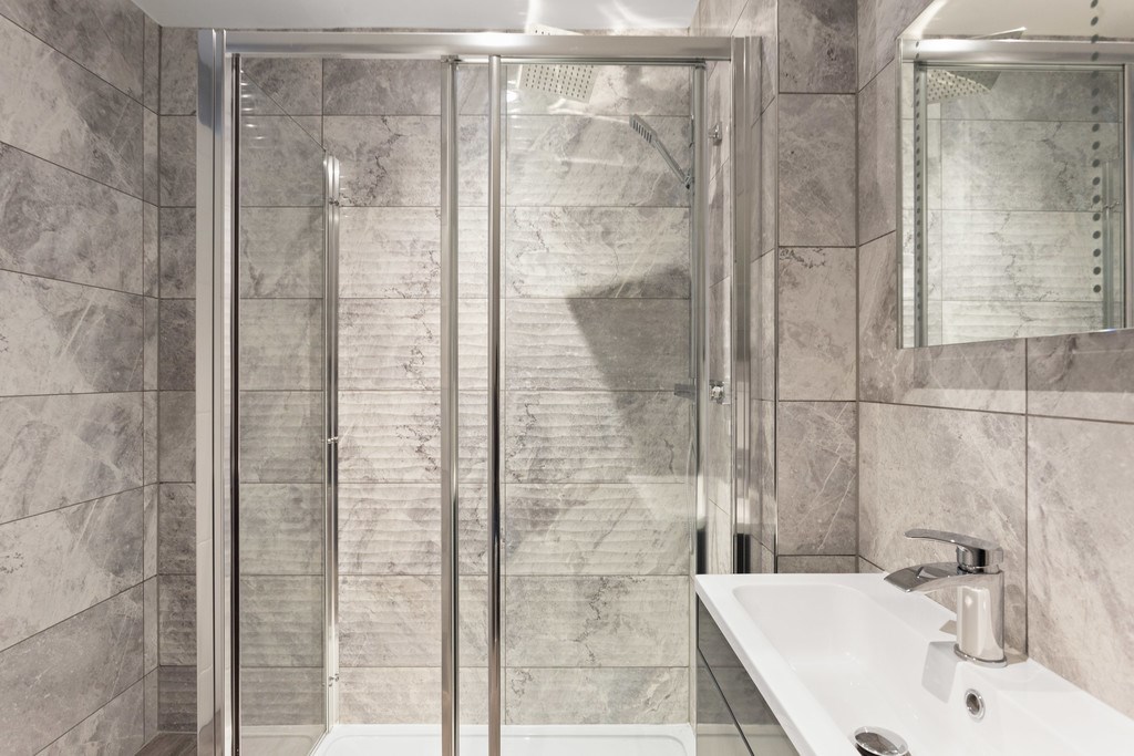SHOWER ROOM Shower room is fitted with a modern suite and has beautifully tiled walls and flooring. 2 piece white suite with storage under the sink. Shower cubicle is a double enclosure with a mains drench and sprinkle shower. Steel towel rail.