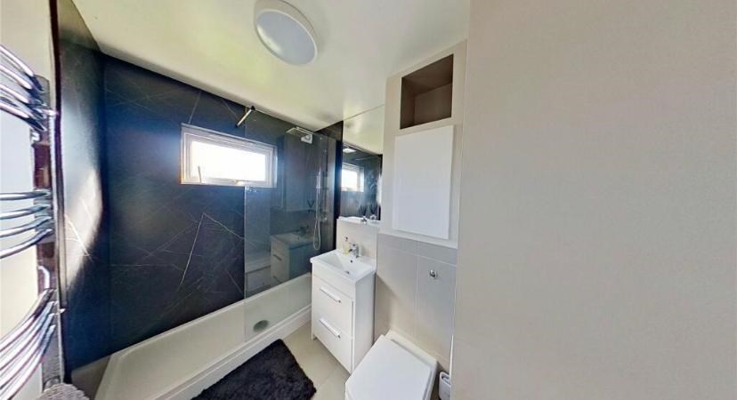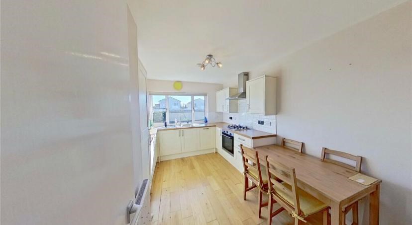 The property comprises a generous lounge with large window allowing for excellent natural light, a modern fitted kitchen with integrated appliances and ample dining space, and two well-proportioned bedrooms. The contemporary bathroom is finished to a high standard and includes a walk-in shower with an overhead mains shower.