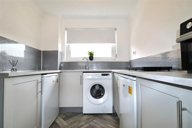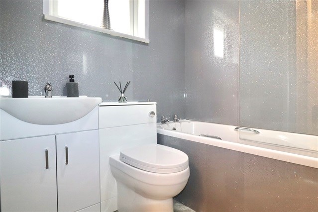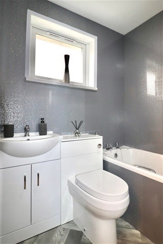 Further you will find the spacious double bedroom and modern bathroom boasting a sleek white suite, electric shower over bath, and striking grey wet wall for a contemporary finish.