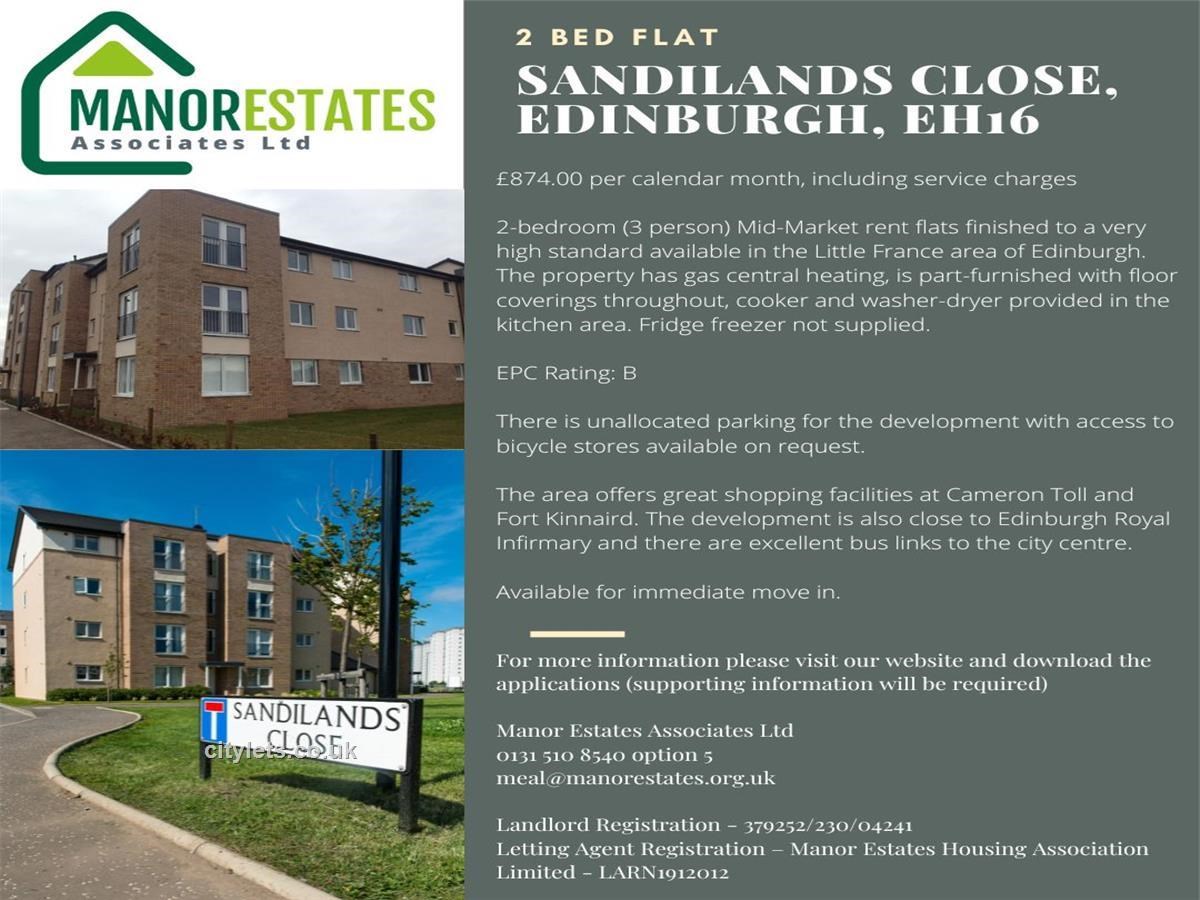 Manor Estates have two available Mid-Market properties in the Little France area of Edinburgh which is Sandilands Close, EH16. All of the available properties are 2 bedroom flats, suitable for a maximum of 3 people with a monthly rent of £874.00 and a deposit of £874.00 payable in advance. They come with all carpets/floor coverings, washer/dryer, oven/hob/hood. Please note no fridge freezer is provided.