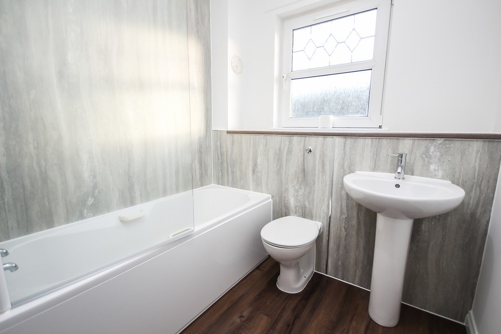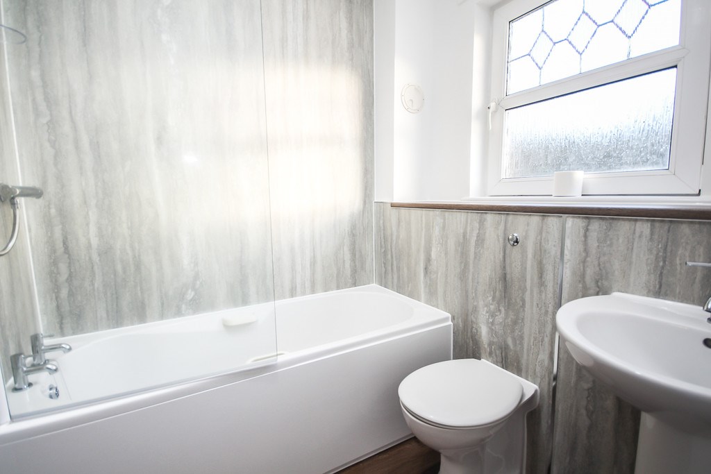 The bathroom consists of modern décor, bathtub with overhead mains shower, basin and w/c.