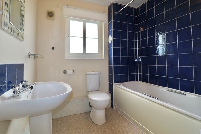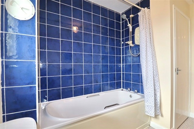 The bathroom comprises a three-piece suite with an electric shower over the bath, complemented by distinctive blue tiling and practical storage.