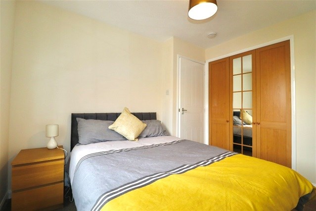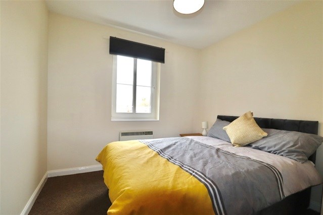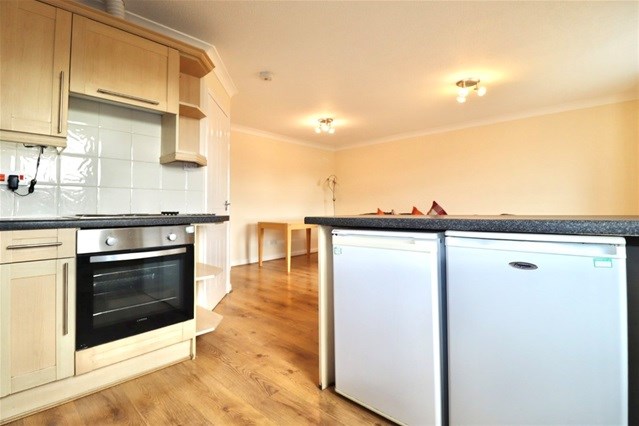 The property features two generous double bedrooms, both with built-in wardrobe storage. The open-plan kitchen and living area is bright and welcoming, with large windows and French doors opening onto a Juliet balcony, allowing plenty of natural light to fill the room.