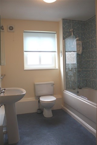 Attractive family bathroom, with white suite including new over-bath shower, contemporary tiling and newly installed storage