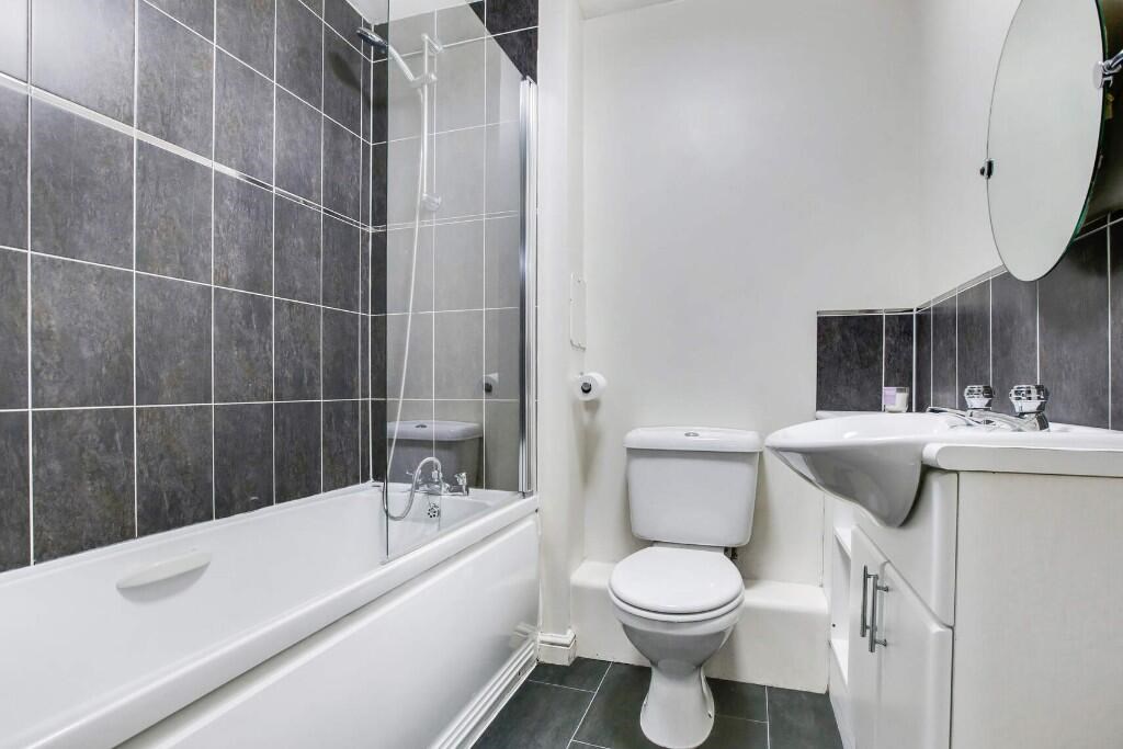 The part-tiled bathroom is fitted with a white recessed wash hand basin and vanity unit, WC and bath with overbath shower and glazed screen. Dimplex heater and extractor fan.