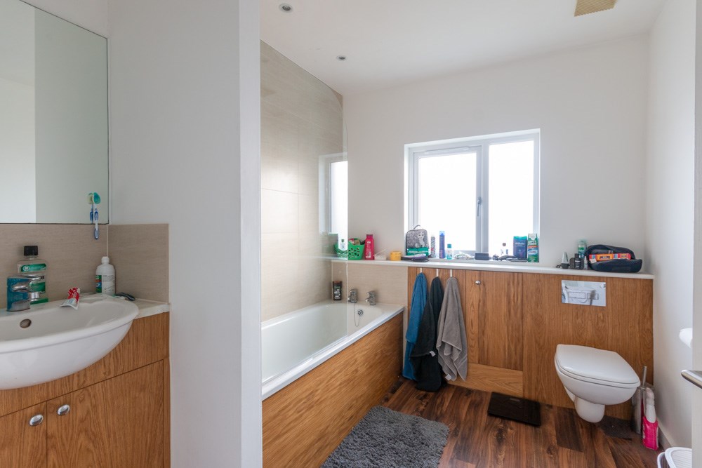 ~Desirable bathroom suite with mains shower over bath and stylish wooden finish