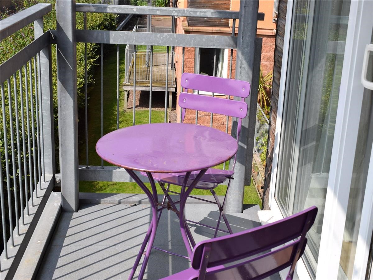 The flat comprises an open-plan living room/kitchen area with a private balcony, two double bedrooms (one with en-suite bathroom), and a modern shower room. The property further benefits from gas central heating, double glazing, communal garden, and resident parking.