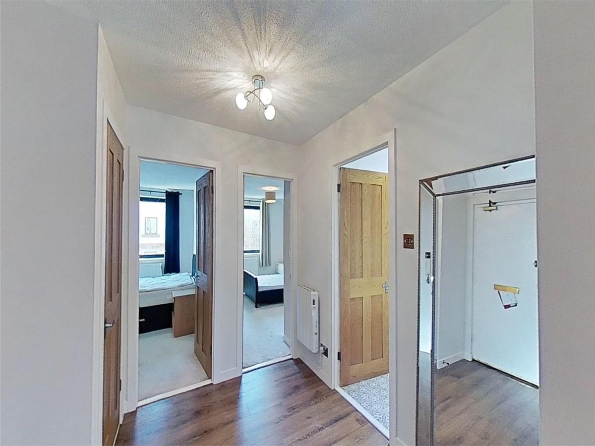 This stylish two-bedroom flat is accessed via a secure communal entrance with a convenient telephone entry system. A well-lit stairwell leads to the front door, which opens into a spacious and welcoming reception hall with solid wood flooring and two useful storage cupboards.