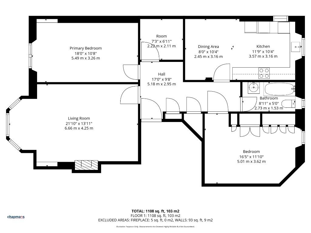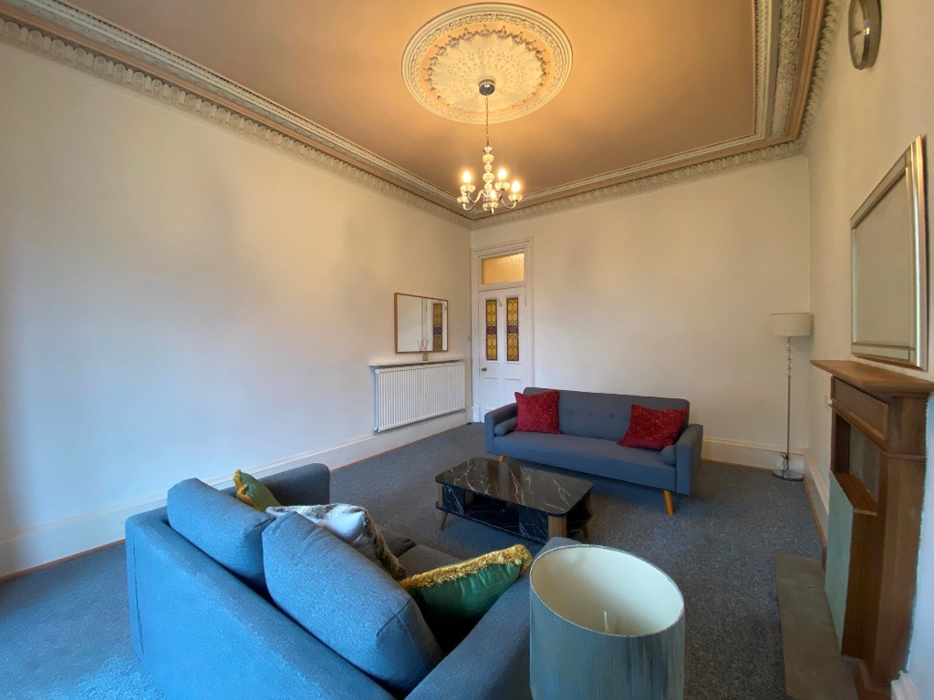 The large living room is neatly decorated with two 3-seater sofas, coffee table and additional side tables. The centre piece of the room is the fire place with a decorative mirror above. The room has 3 large bay windows allowing plenty of light to fill the space. The room has some traditional features with a ceiling rose, detailed cornicing and an Edinburgh press.
