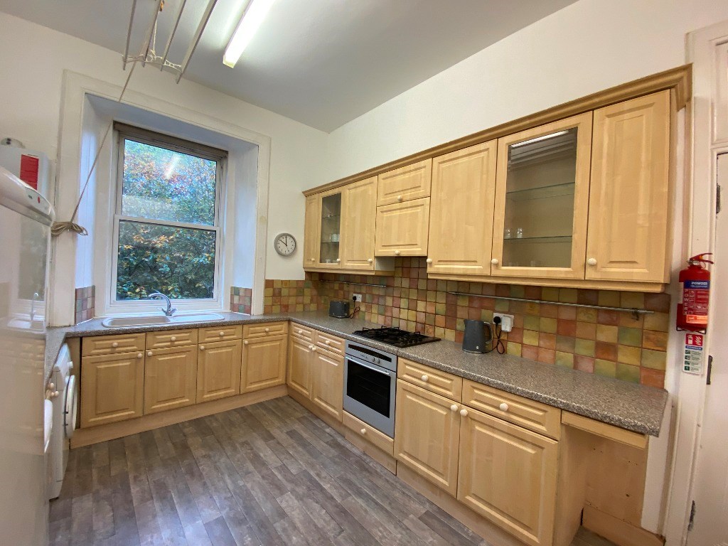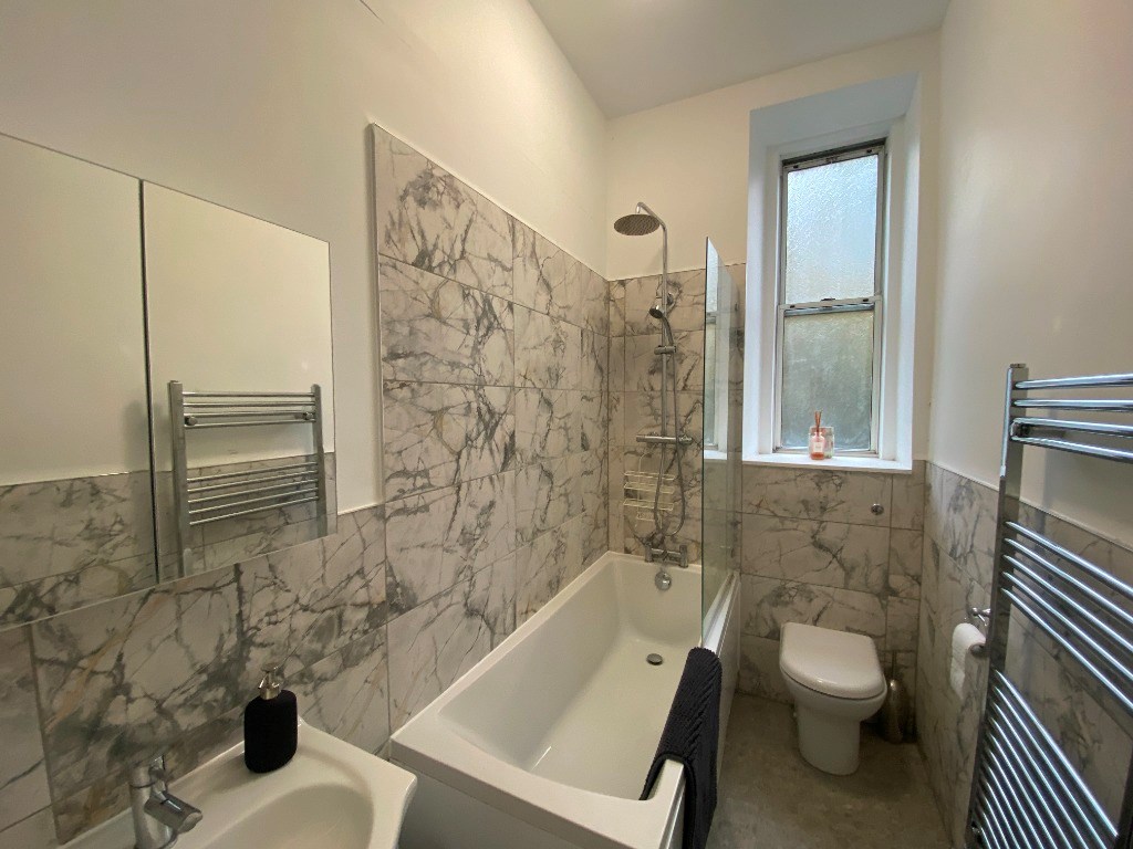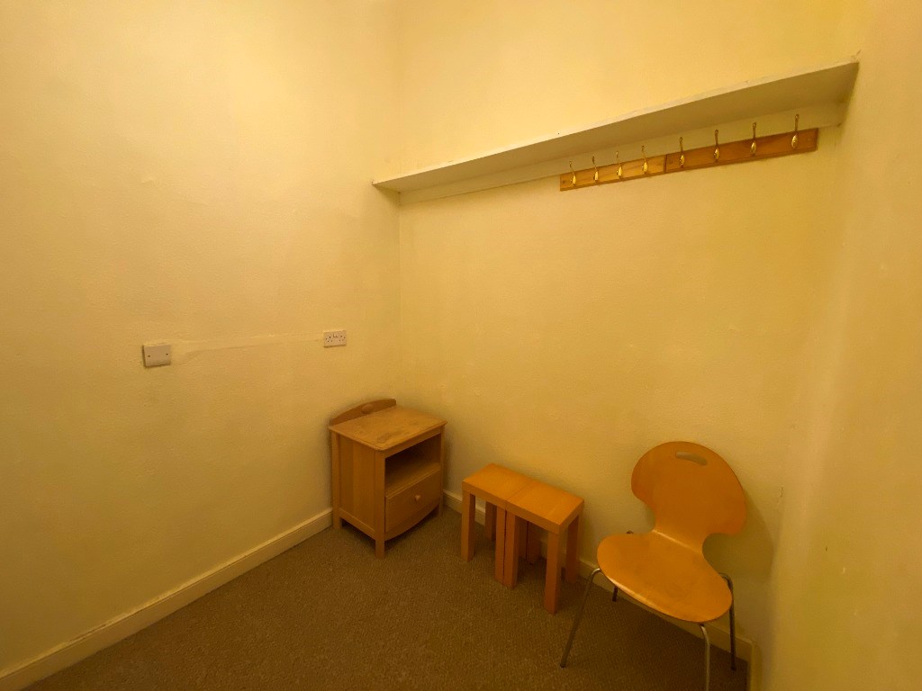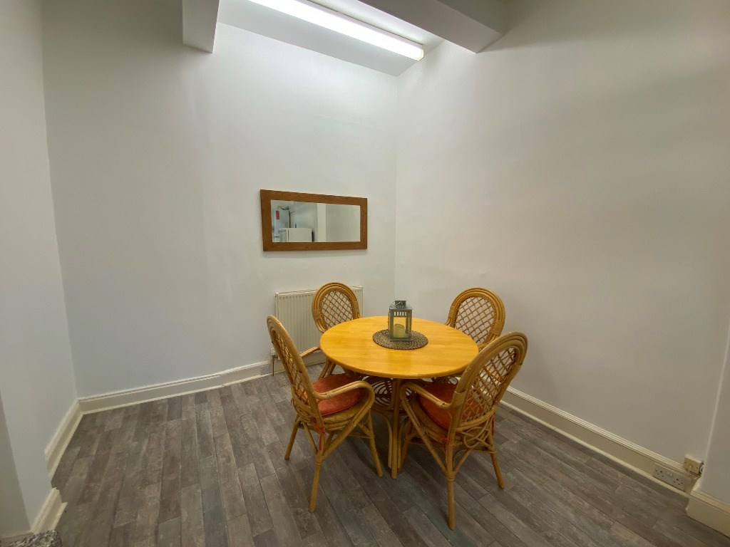 The open plan kitchen/dining room is spacious with a round dining table with 4 chairs. The kitchen comes fully equipped with a full sized fridge, separate freezer , microwave, electric oven, gas hob, washing machine kettle and toaster. The kitchen/dining room has plenty of countertop space and cupboard storage. There is a pulley perfect for drying clothes. There is a large window overlooking the communal garden and allowing light into the room.
