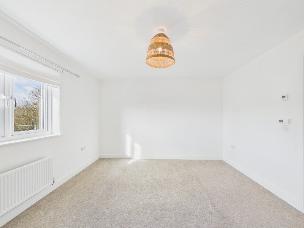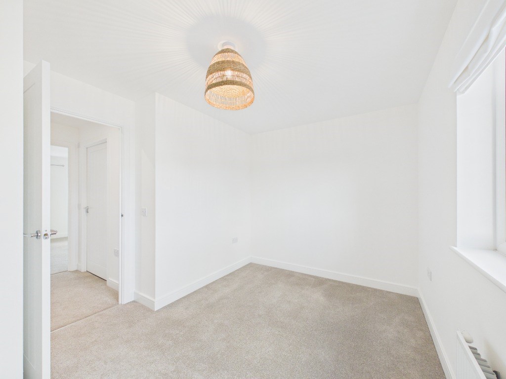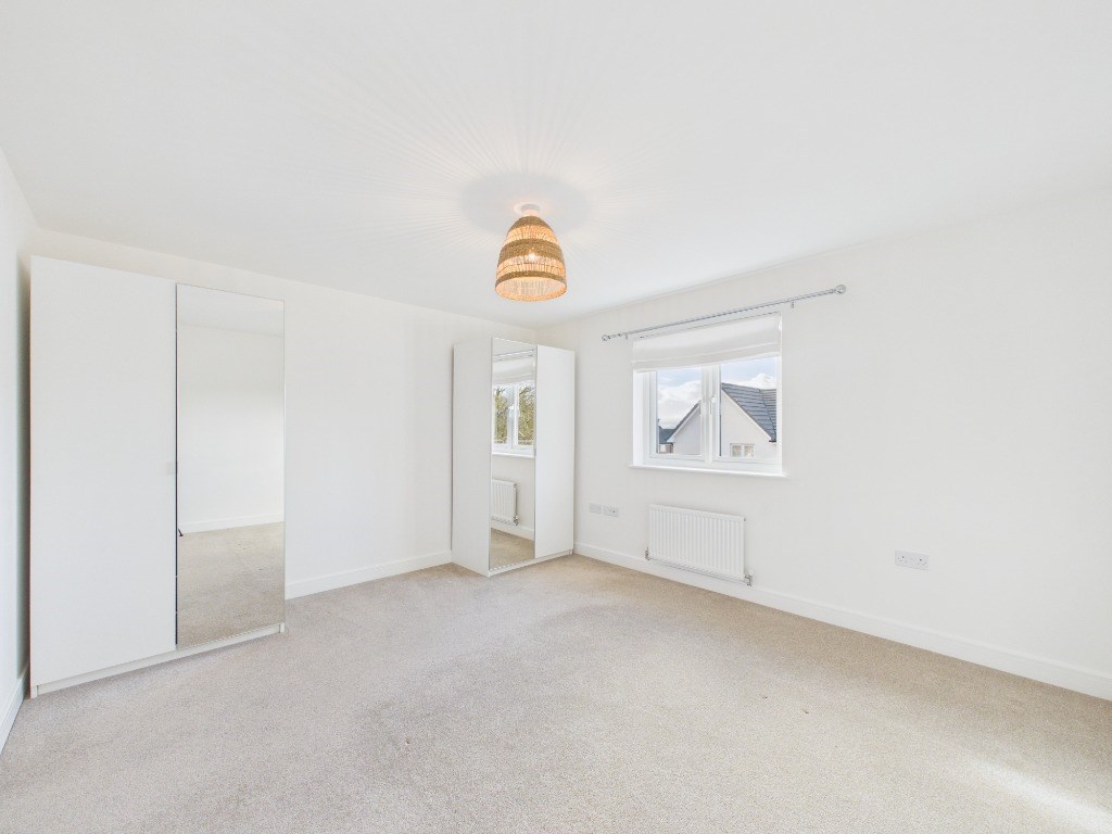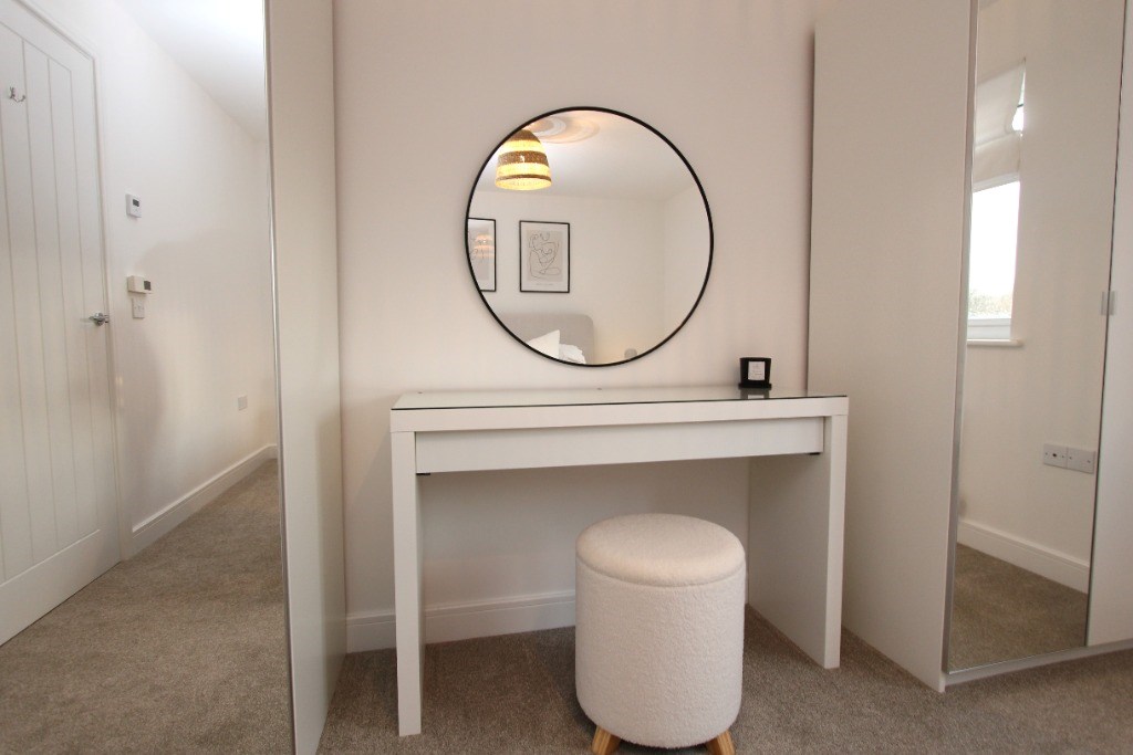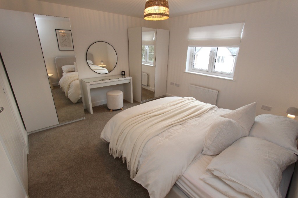 Upstairs, the first floor offers two generously sized double bedrooms. The master bedroom includes two double wardrobes. The second bedroom features a built-in workspace, ideal for a home office. A contemporary bathroom with a shower over the bath completes the upper level. Please note that some pictured furnishings, including both double beds, have been removed.