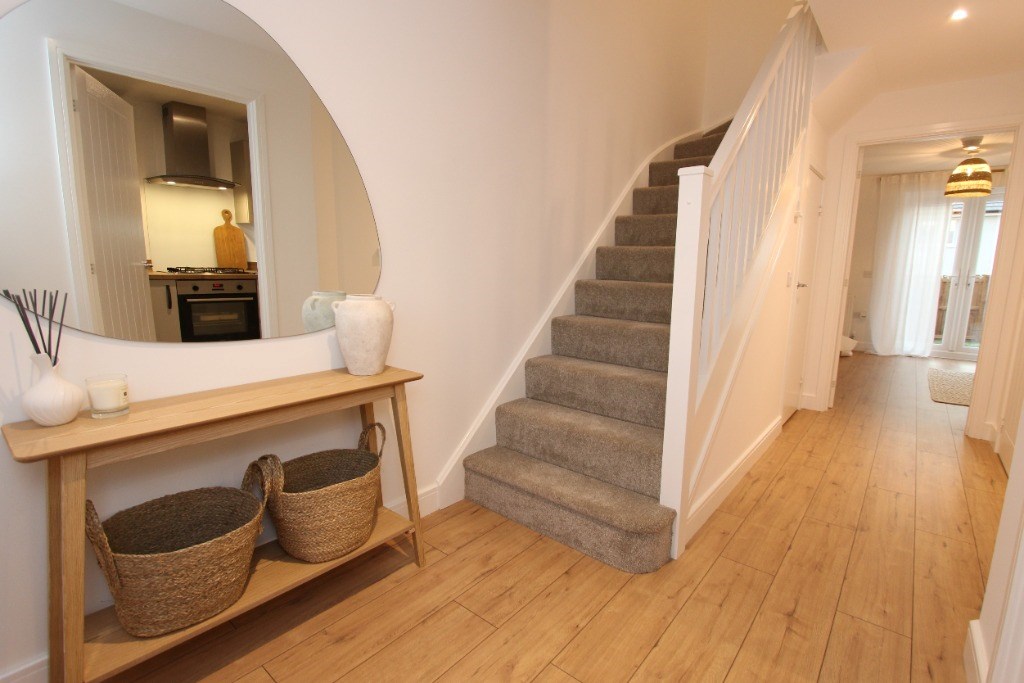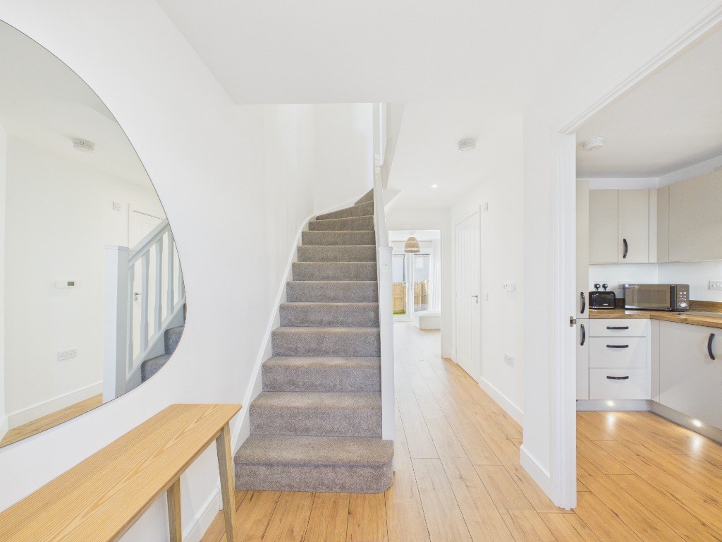 The ground floor features an inviting entrance hallway leading to a fully fitted kitchen with integrated appliances, including a washing machine, dishwasher, and fridge/freezer. The spacious lounge opens through patio doors to a south-facing private garden, perfect for relaxing or entertaining in the sunniest part of the day.