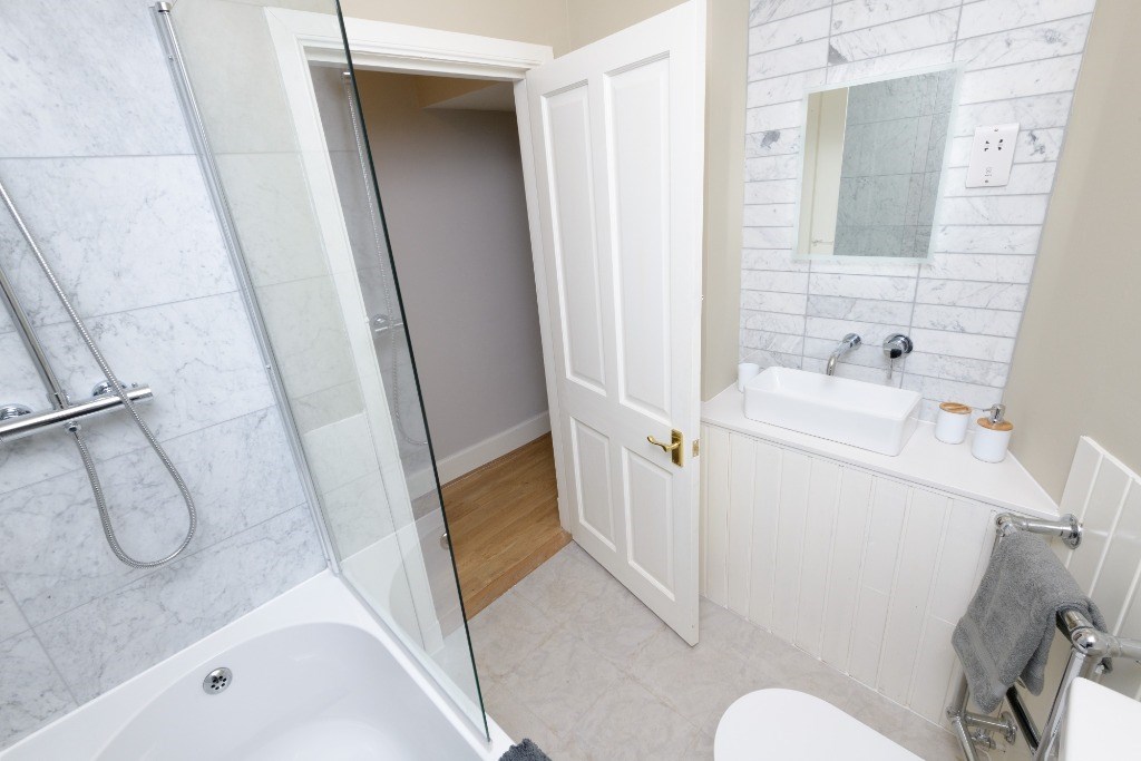 Upstairs are two bedrooms, the main double bedroom and a twin bedroom with ample storage space. The property also benefits from private off-street parking for one vehicle in addition to ample free parking in the adjacent Meadowbank Car Park.