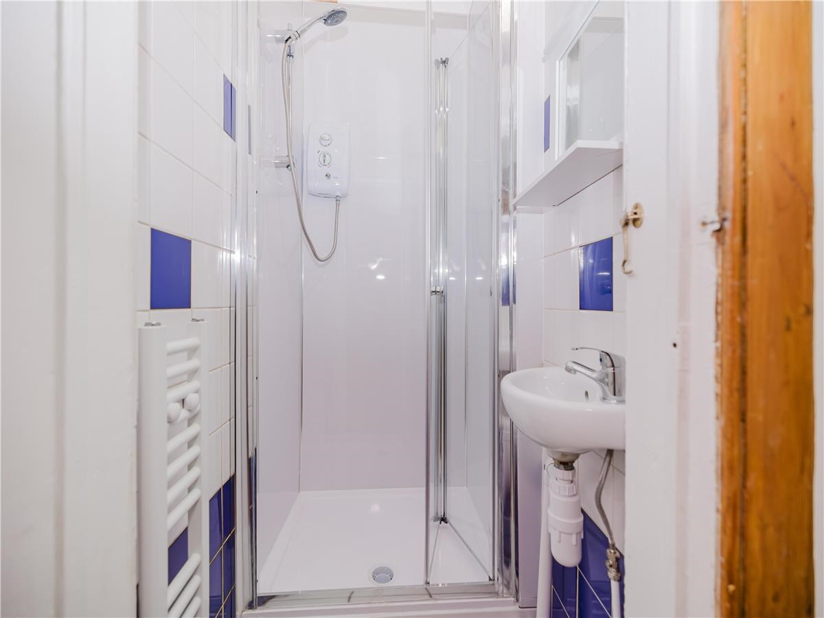 ~Tiled shower room with electric shower and wash-hand basin