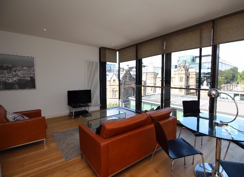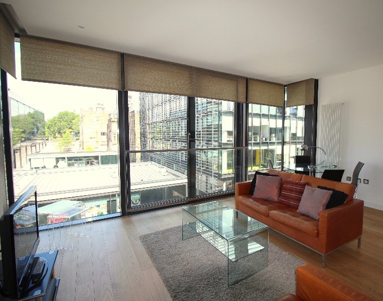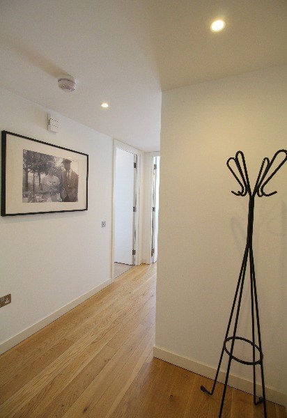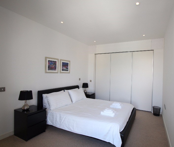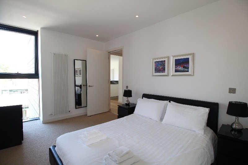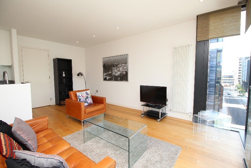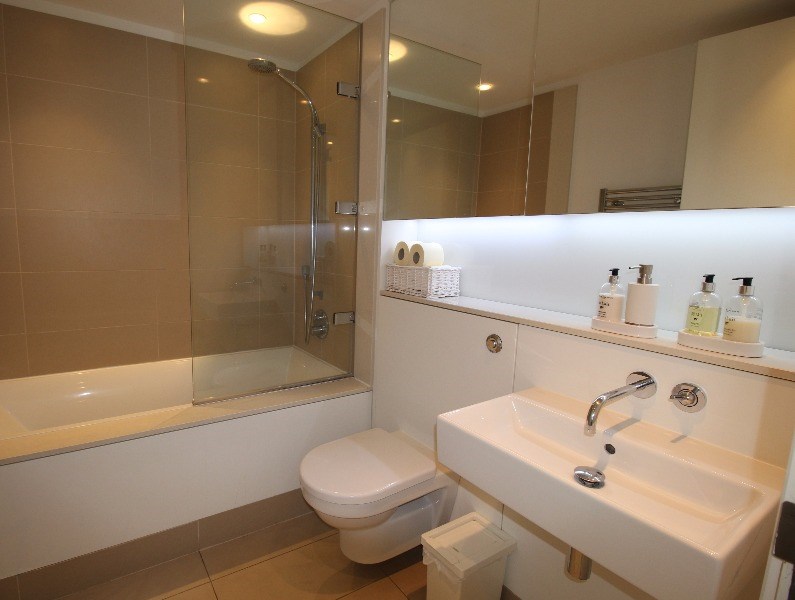 The apartment is light and airy, and would suit a single guest or couple. Accommodation comprises: hall, open plan living and kitchen, which enjoys views across Lister Square. The kitchen features integrated appliances including, fridge freezer, oven, microwave and dishwasher. The living room features a dining table and seating for 4, television and plenty of space to relax.