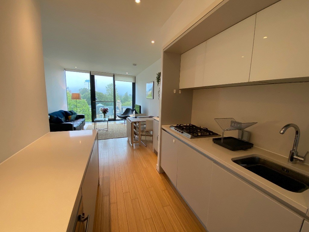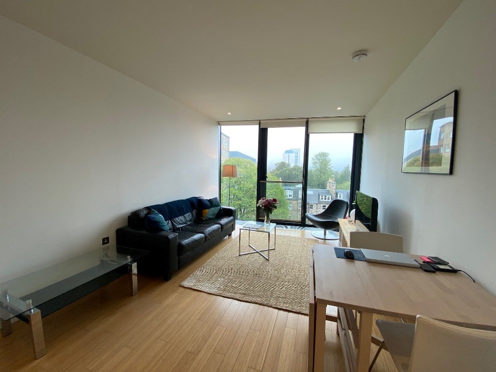 The fifth-floor, fully furnished property comprises an open-plan kitchen and living area with dining space, a double bedroom with built-in wardrobe, bathroom with shower, a spacious entrance hall, and a separate utility room. The property also enjoys fantastic views towards Arthur’s Seat and the Meadows.