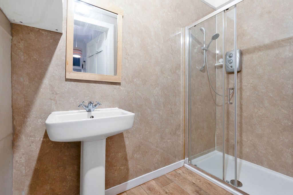 ~Contemporary shower room with walk-in cubicle and wash-hand basin