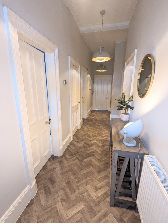 Perfectly positioned on Warrender Park Terrace at the top of Bruntsfield Links, this impressive home offers its own private entrance with a welcoming vestibule. To the front, a spacious lounge showcases a beautiful bay window framing direct views of the Castle. Traditional Edinburgh features elevate the room, including working shutters, double-height ceilings with original cornicing, and an elegant decorative fireplace.