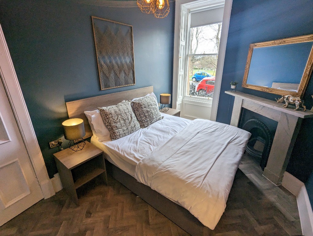 Across the hall, a comfortable double bedroom also enjoys views of the Castle. The contemporary bathroom features a shower-over-bath, and a stylish vanity unit.