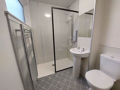 The modern bathroom has an electric shower with walk-in shower enclosure and a modern towel rail.