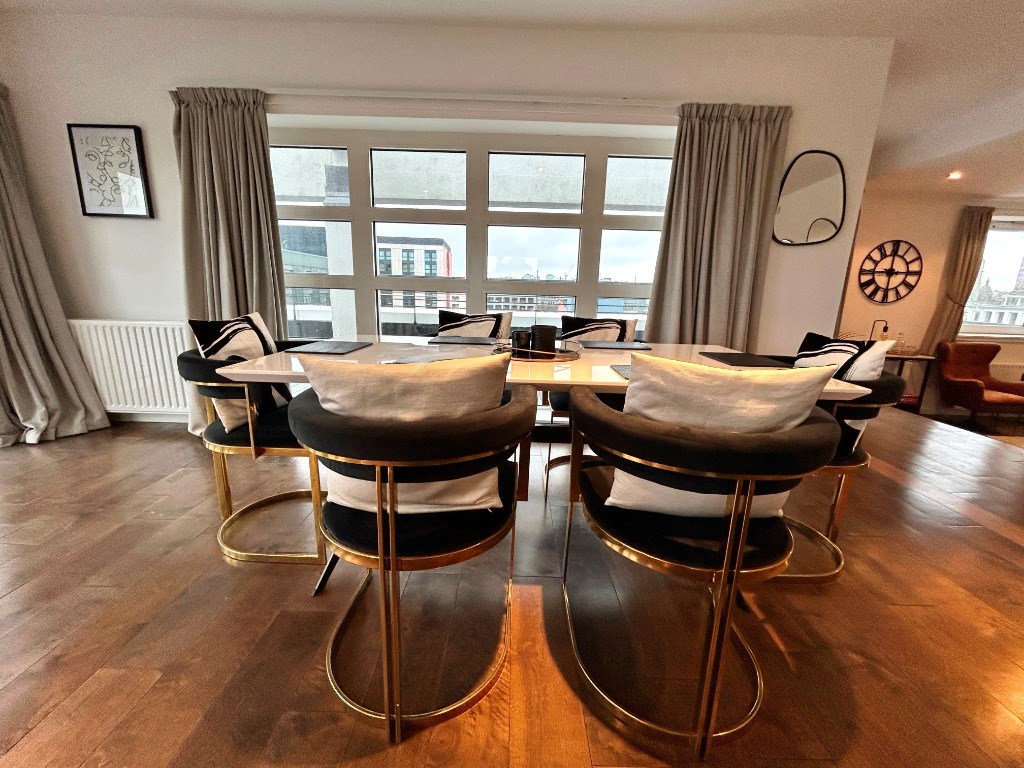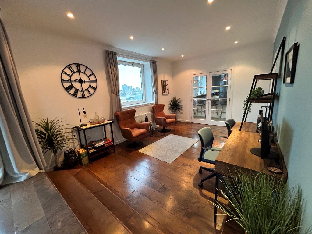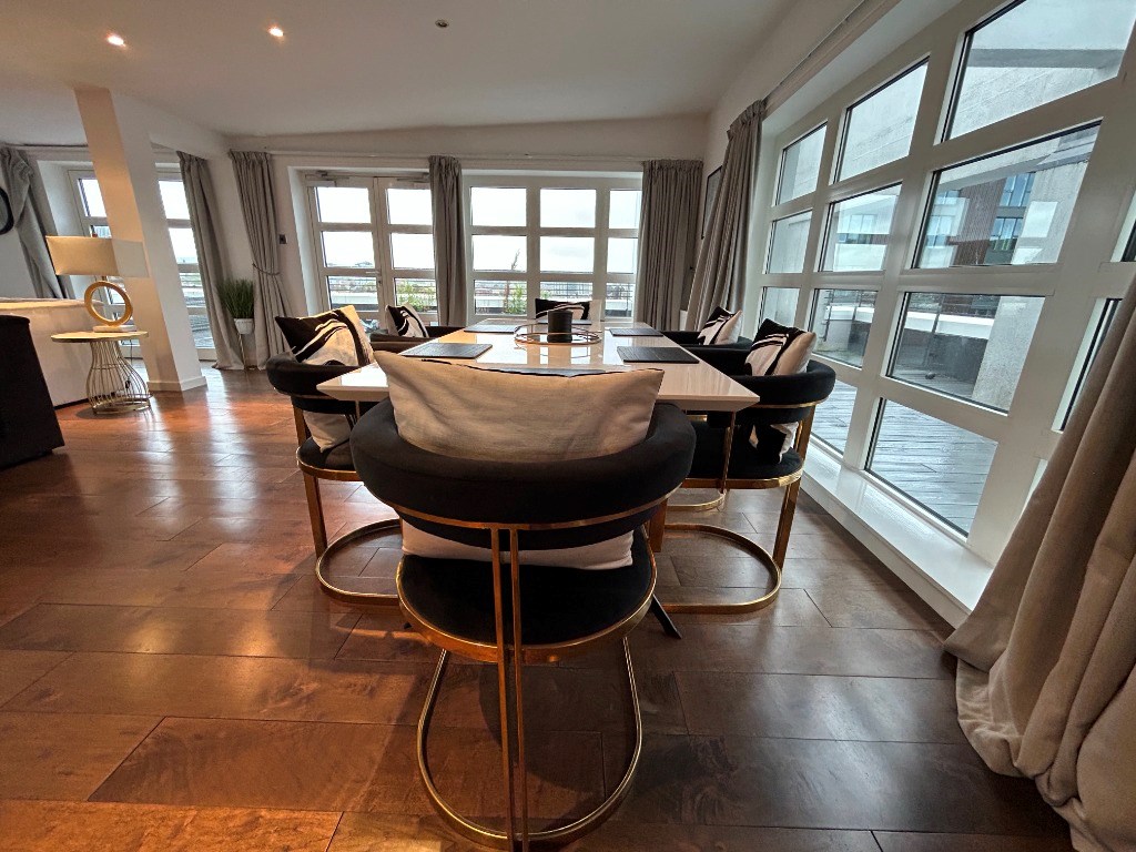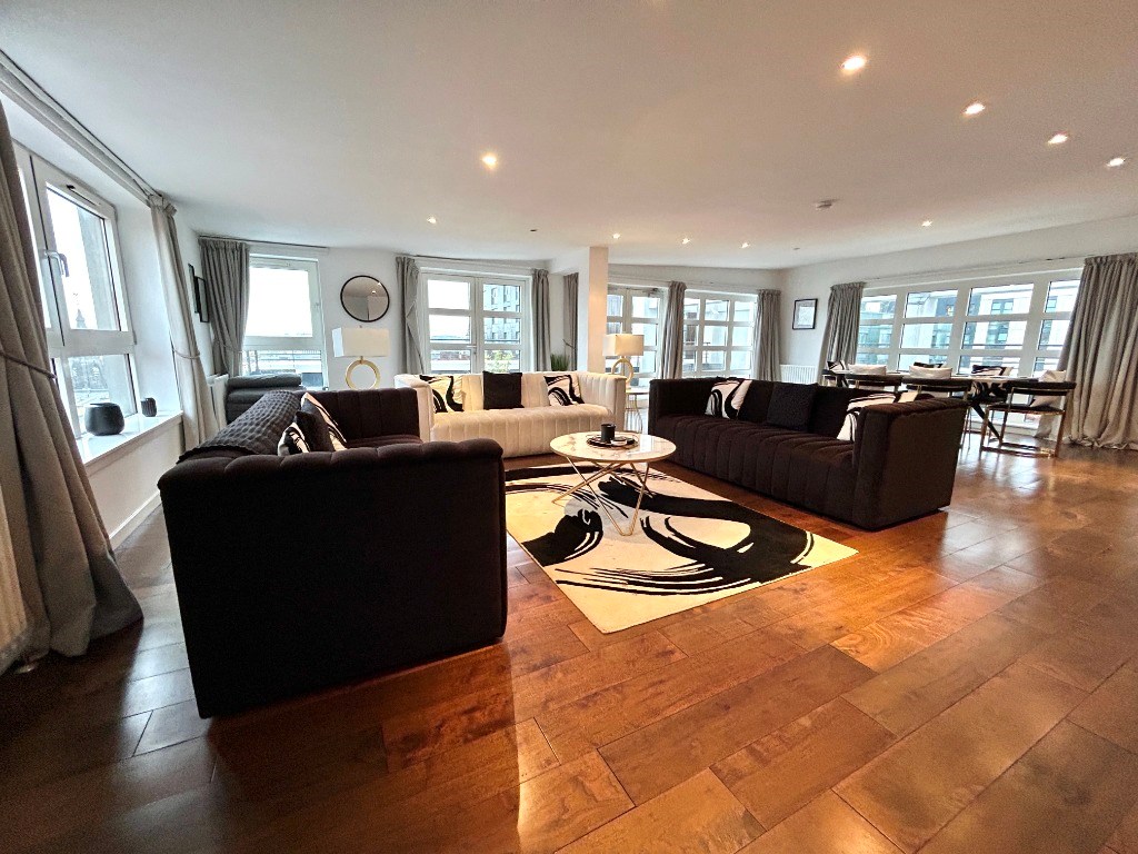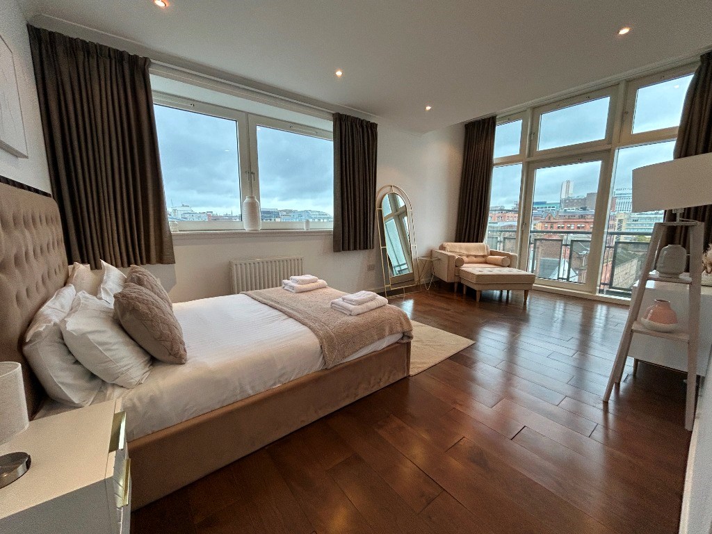 Perhaps the most striking feature of this penthouse is its wrap-around balcony, running the full length of the living and dining space which provides stunning views across the city skyline. Whether it’s a morning coffee in the sun or evening drinks overlooking Merchant City, this outdoor space offers a rare opportunity to enjoy Glasgow from a truly unique perspective.