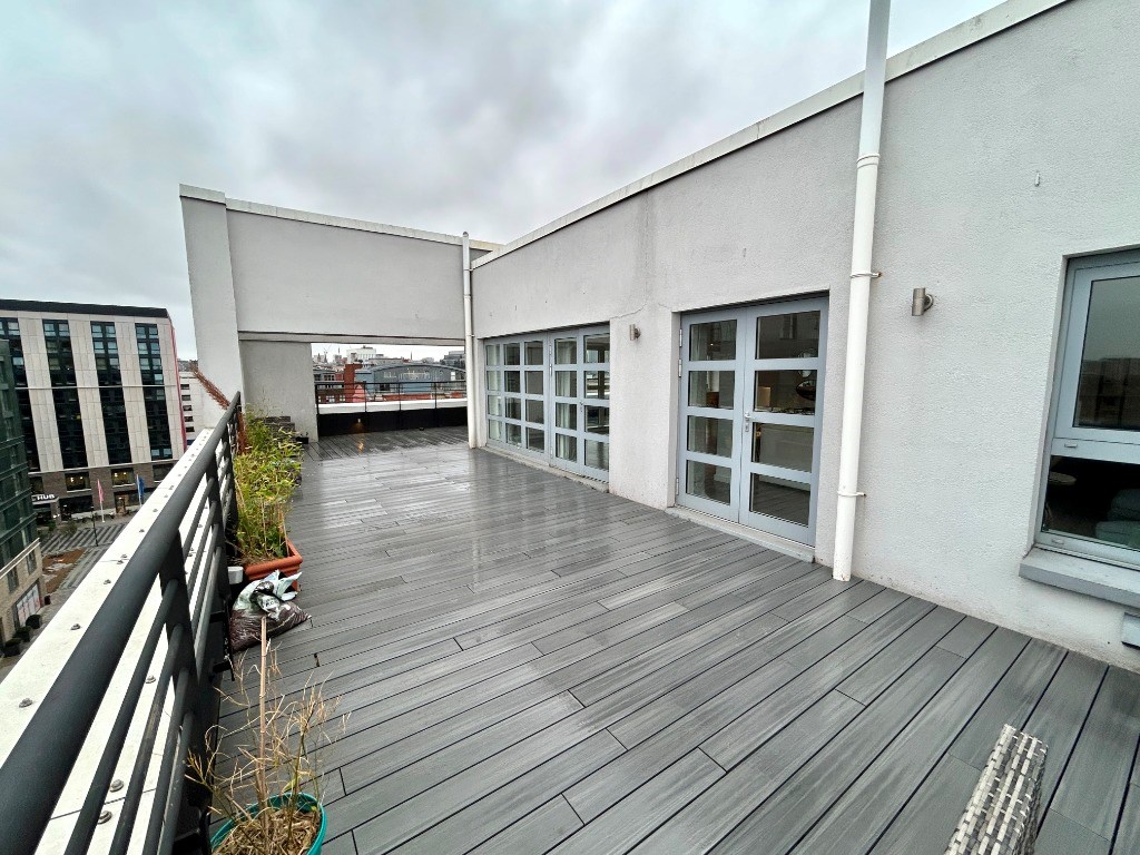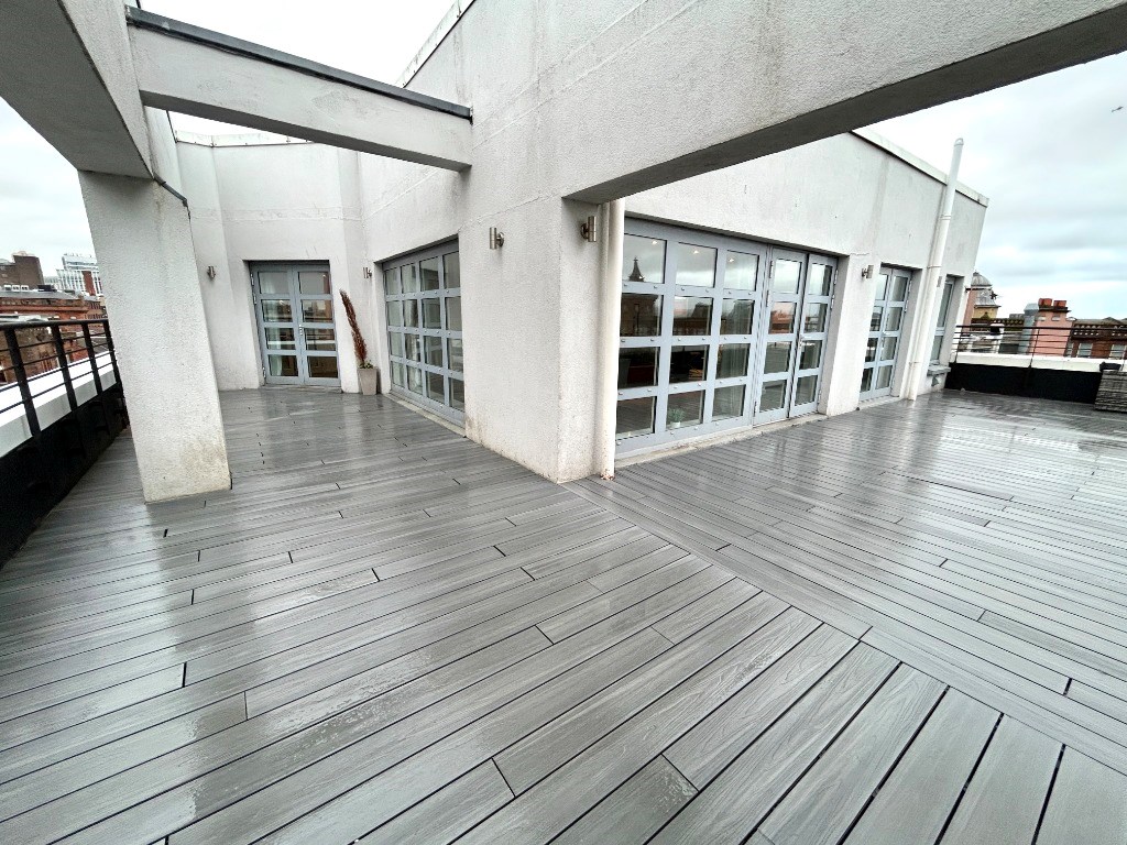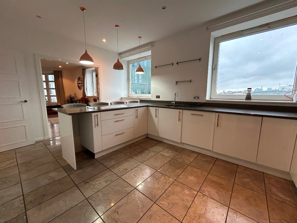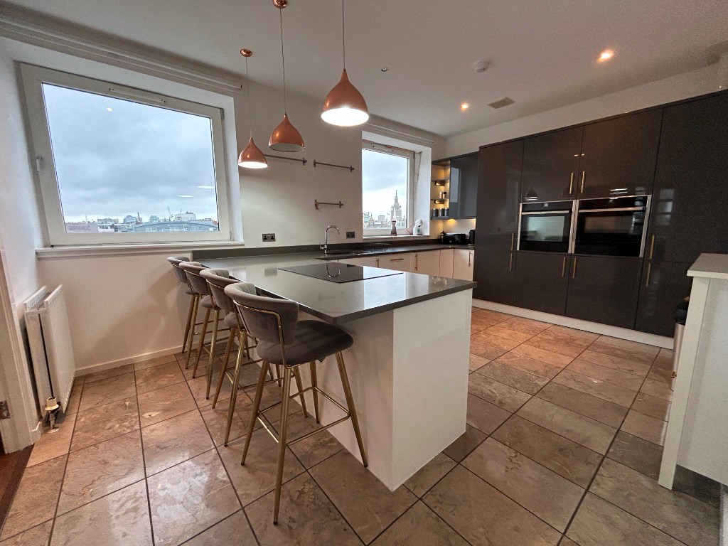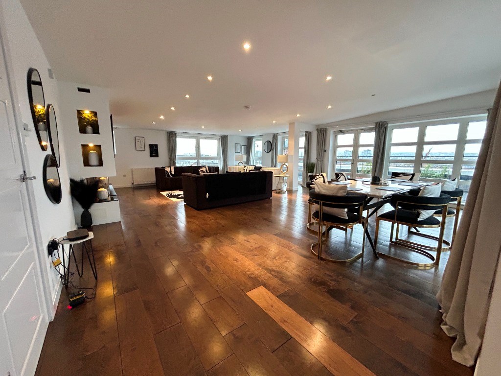 Perhaps the most striking feature of this penthouse is its wrap-around balcony, running the full length of the living and dining space which provides stunning views across the city skyline. Whether it’s a morning coffee in the sun or evening drinks overlooking Merchant City, this outdoor space offers a rare opportunity to enjoy Glasgow from a truly unique perspective.