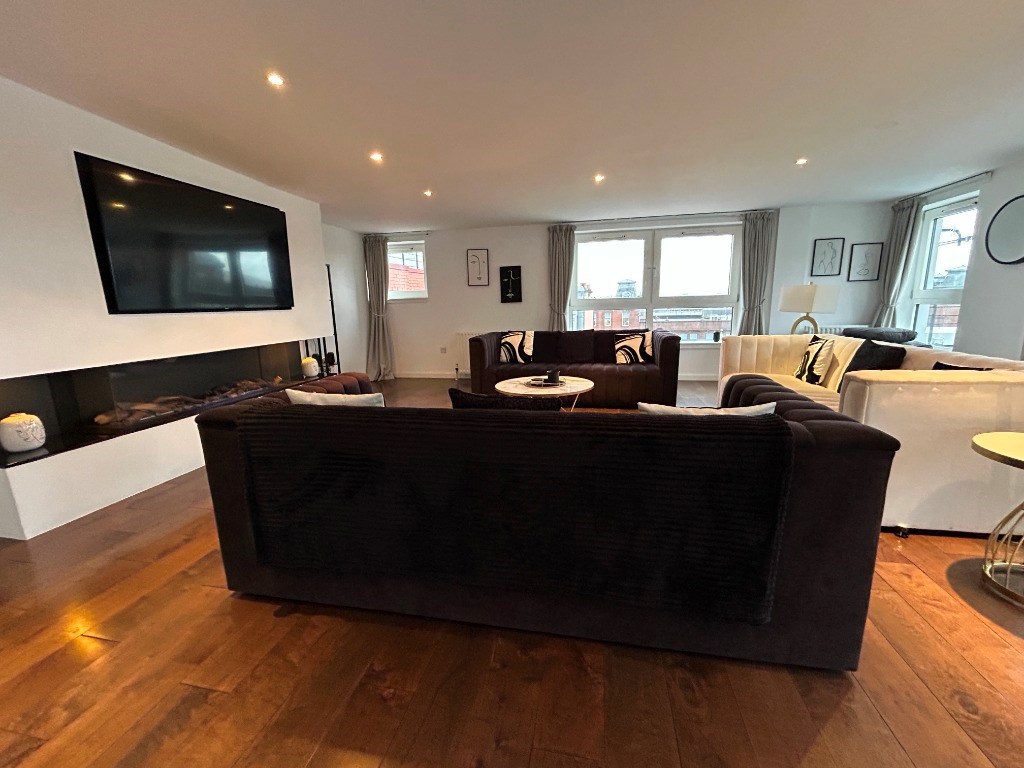 The apartment offers an impressive sense of space and light, with a bright and expansive open-plan lounge and dining area that creates the perfect setting for both entertaining and everyday living. A striking feature fireplace adds a luxurious touch, while the adjoining study space provides a private corner ideally suited for home working. Flowing seamlessly from the living area, the modern fitted kitchen is designed with both style and practicality in mind. It comes fully equipped with high-quality integrated appliances including a dishwasher, fridge/freezer, microwave, oven and electric hob, complemented by sleek cabinetry and a breakfast bar that makes casual dining a pleasure.