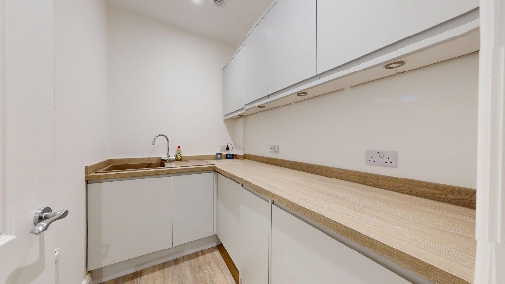 This contemporary apartment in Aberdeen offers a harmonious blend of modern design and practical living. The 83 sq.m space encompasses two bedrooms, a bathroom, and an open-plan living area. The kitchen showcases sleek white cabinetry with wooden countertops and integrated appliances. Large windows throughout provide ample natural light and garden views. The living room features a traditional fireplace with a modern twist, while the bathroom boasts stylish dark tiling and a glass shower enclosure. Wood flooring in common areas and carpet in bedrooms add warmth and comfort. The property also includes an office space and laundry facilities, making it ideal for modern living. EPC rating: C. Landlord Registration Number: 1797491/100/13022. Letting Agent Registration Number: 1811019.