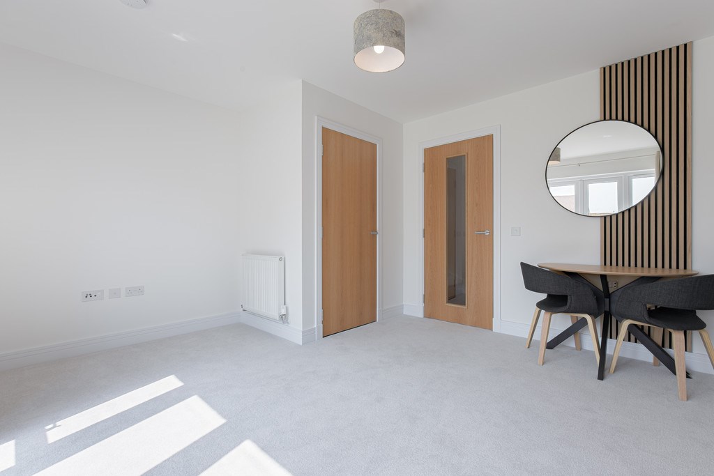 Built-in wardrobes with sleek panelled doors provide ample storage, keeping the space clutter-free. Whether used for sleeping or working, this room offers a quiet, comfortable setting with stylish simplicity.