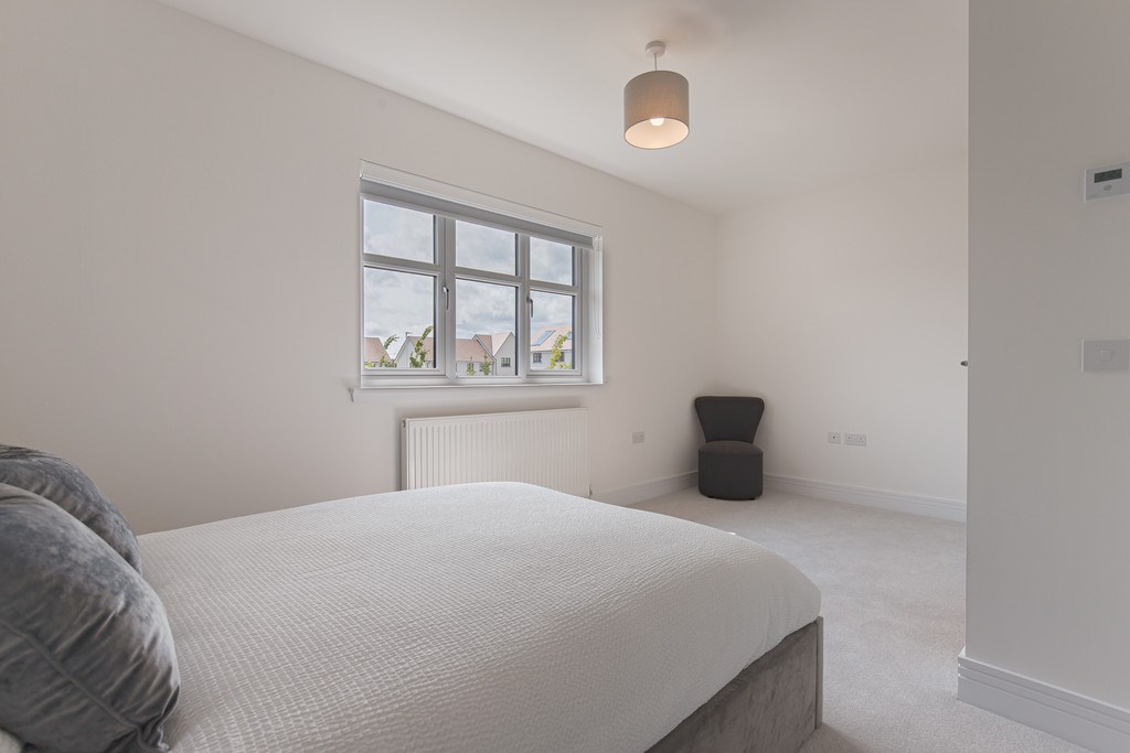 1ST FLOOR PRINCIPLE BEDROOM Generously proportioned and elegantly finished, the principal bedroom offers a calm and restful retreat. A large window fills the room with natural light and provides an open outlook over the rear garden of the property. The feature wall with textured wallpaper adds visual interest, while the neutral tones and plush carpet create a cosy, luxurious atmosphere.