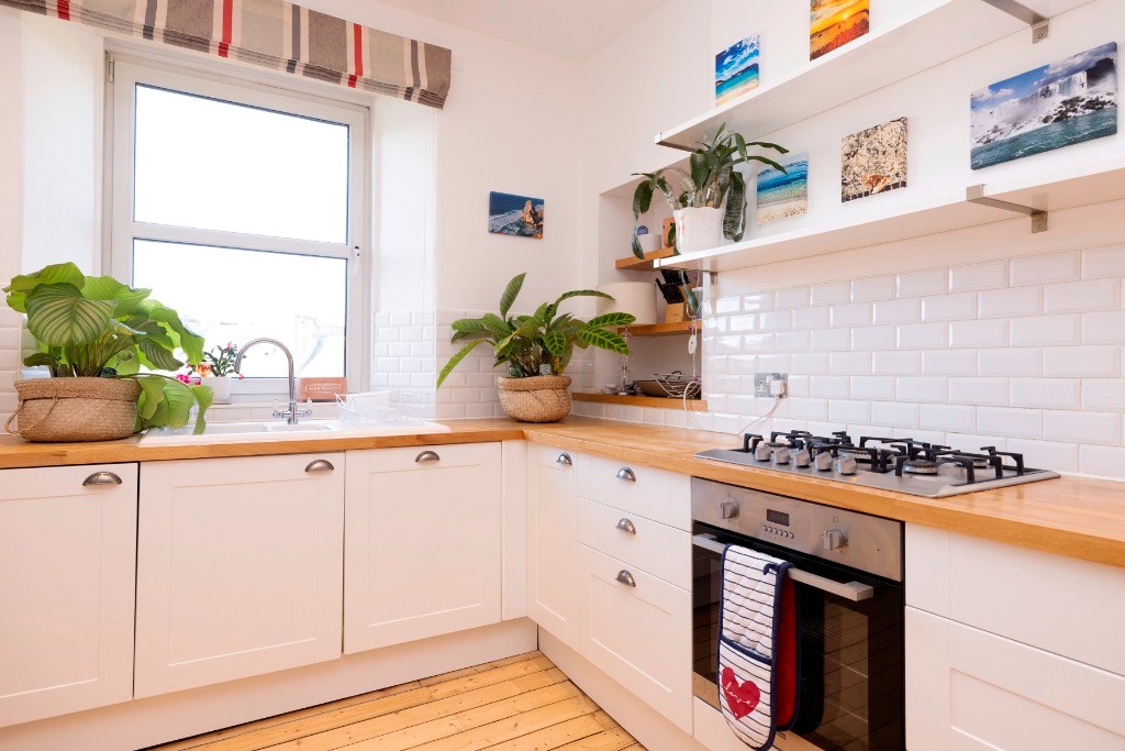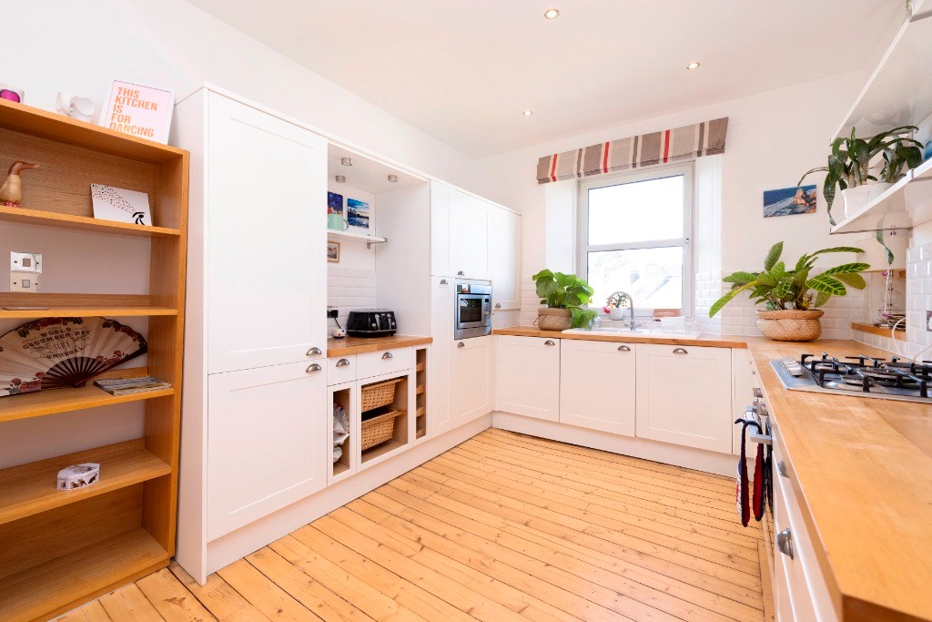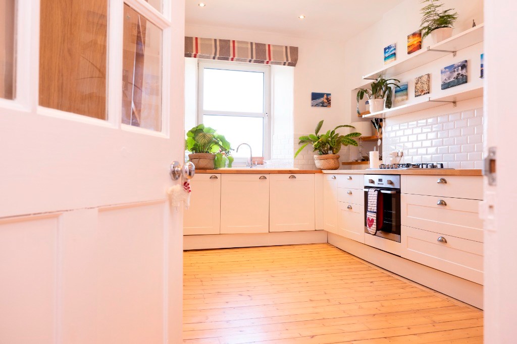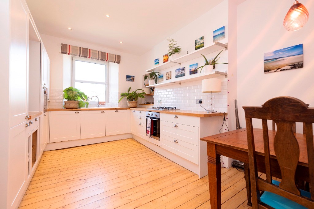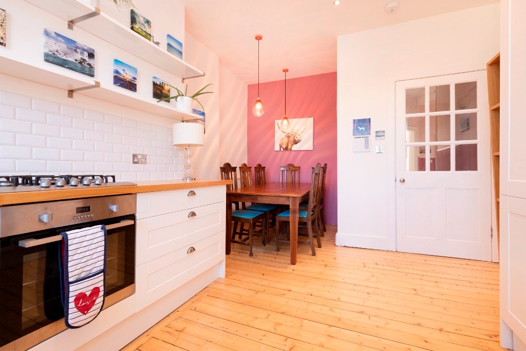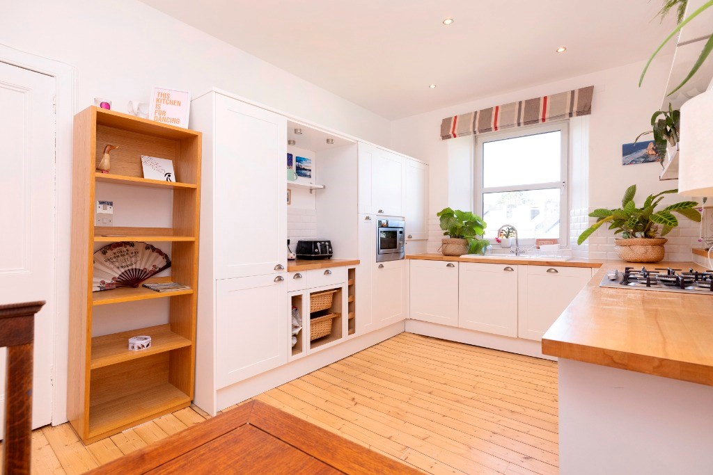 Located on the second floor, accommodation comprises; a large double bedroom, bathroom with shower over the bath, comfortable living room flooded with natural light from the bay window with a decorative fireplace, and a separate fully equipped kitchen with gas hob, oven, fridge, freezer and a dining table for 4 guests.