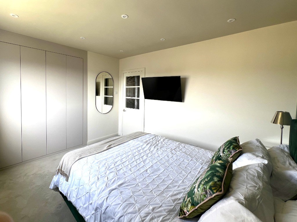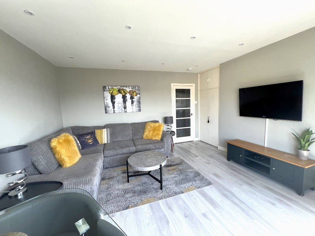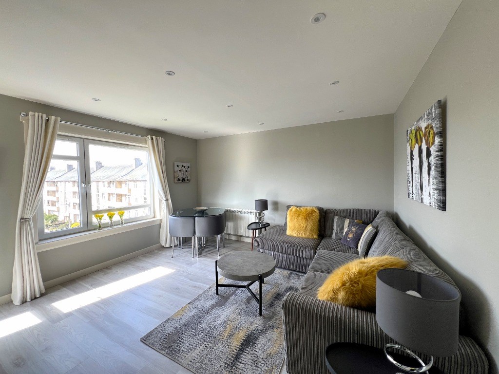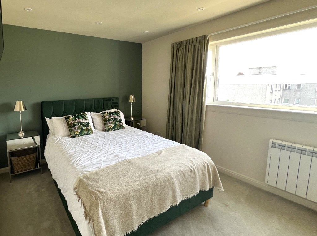 A standout feature of this apartment is its large living/dining room. This room comes fully furnished with a large corner sofa and a circular dining table (with four nesting chairs). There is plenty of floor space and natural light floods into this west-facing room. There is concealed shelving for additional storage and a wall-mounted TV. The living-dining room has access to the good-sized balcony with expansive views overlooking Morningside towards the Braid and Pentland Hills. The balcony is southwest-facing, so it is perfect for the summer sun!