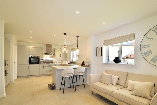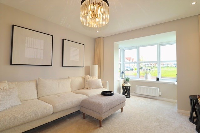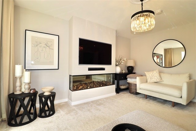 Step into a bright and spacious living room, flooded with natural light thanks to a charming box bay window. The space is beautifully finished with a feature electric wood-effect fire and dedicated wall mounts for a sleek TV setup, perfect for cosy nights in.